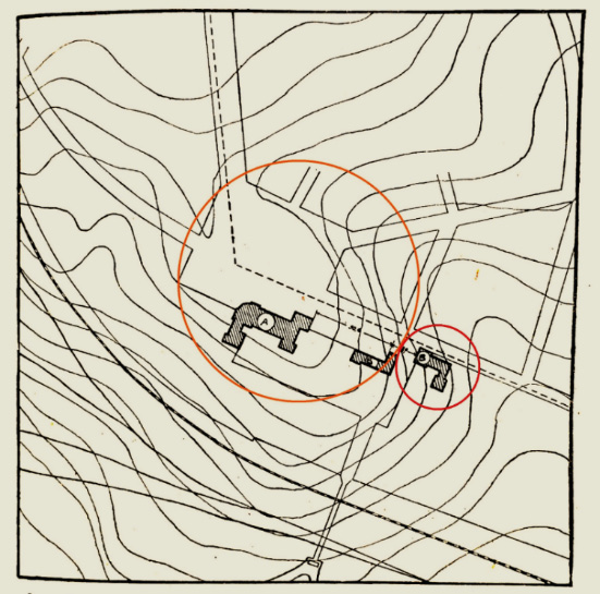 - Группа «обслуживающих» зданий располагалась по периметру (трем сторонам) небольшой входной площади, центром композиции становилась проходная, здание заводоуправления противолежало комплексу из школы ФЗУ, лаборатории и пр. Первоначально именно такое классическое решение было предложено выполнить в проекте генерального плана Уральского машиностроительного завода, но в реализованном варианте школа ФЗУ была сдвинута на восток (за здание лаборатории), где территория напротив транспортного кольца позволяла разместить более крупномасштабный объект, поэтому решение площади из второго типа превратилось в первый тип (рис. 3, 4).