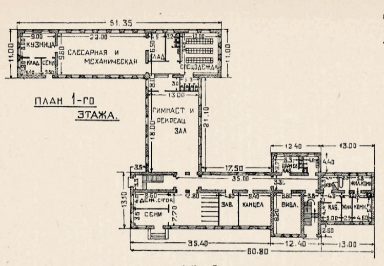 Fig. 9. The FZU building in the socialist city of Uralmash. Architect P.V. Oransky, 1929. Plan of the 1st floor [7]