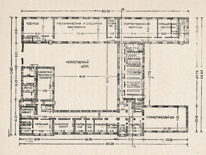 Рис. 6. Здание ФЗУ для Тракторного завода на 182 учащихся. План 1-го этажа [2]