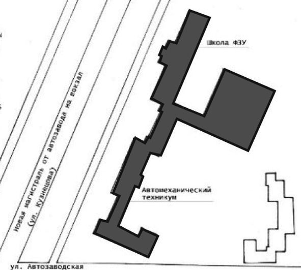 - Комплекс зданий на площади не включал в себя школу ФЗУ, она смещалась в буферную (санитарную) зону между промышленной и жилой территориями, таким образом делая ее равноудаленной и равнодоступной от них.
