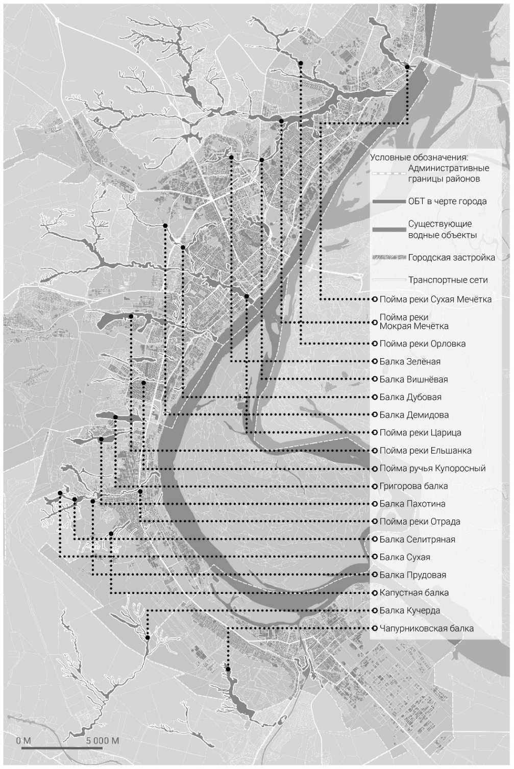 Рис. 2. Пример градостроительного анализа ситуации на территории долины балки Пахотина в Кировском районе Волгограда