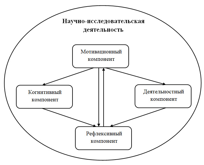 Мотивационный, когнитивный и деятельностный компоненты определяют содержание рефлексивного компонента НИД, который предусматривает развитие у курсантов «способности анализировать, давать оценку и осуществлять рефлексию собственной НИД, корректировать и планировать свои действия» (Трояк, с. 11).
