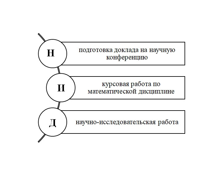 В процессе обучения математике к основным видам НИД курсантов относятся подготовка доклада на научную конференцию, выполнение курсовой работы по математической дисциплине, выполнение научно-исследовательской работы (рис. 2).