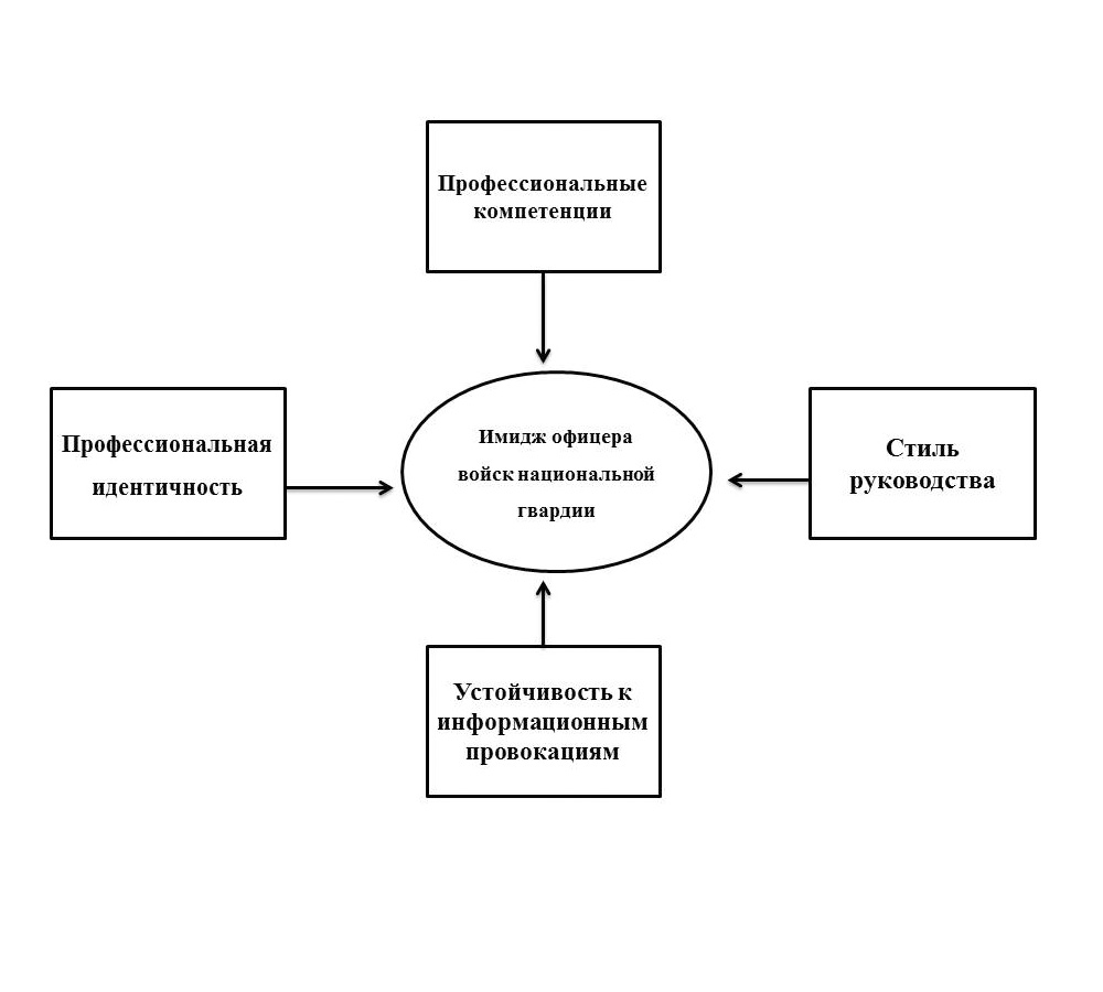 По результатам опроса сформулировано определение имиджа офицера войск национальной гвардии как сложившегося образа с учетом профессиональных качеств, необходимых в служебно- боевой деятельности, верности традициям войск и культуры общения в современных социокультурных условиях, включающего устойчивость к информационным провокациям. На рисунке представлены компоненты имиджа.