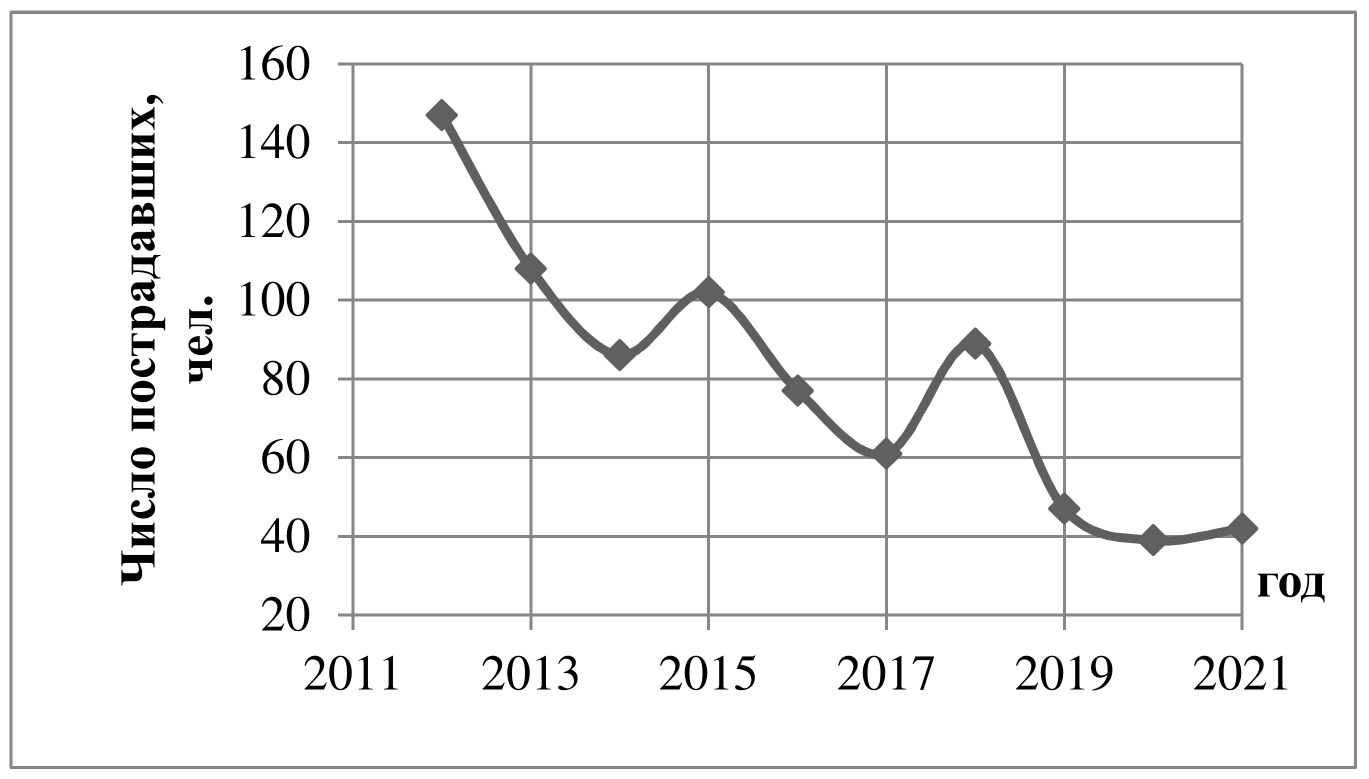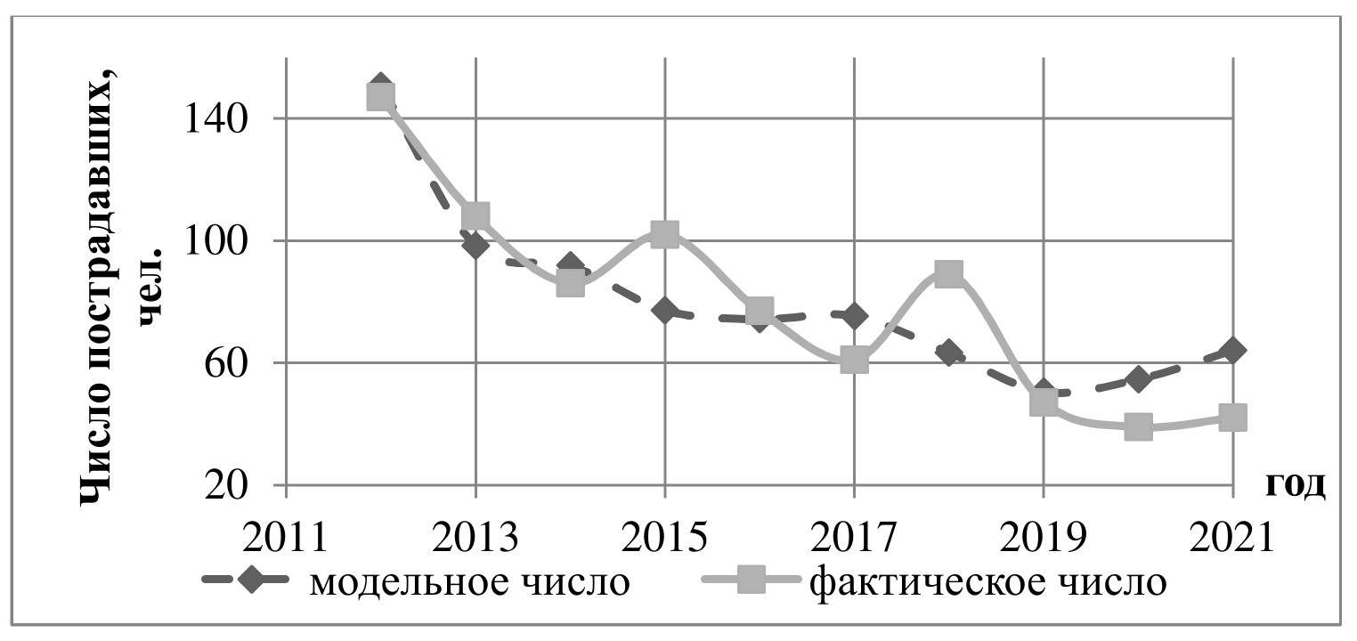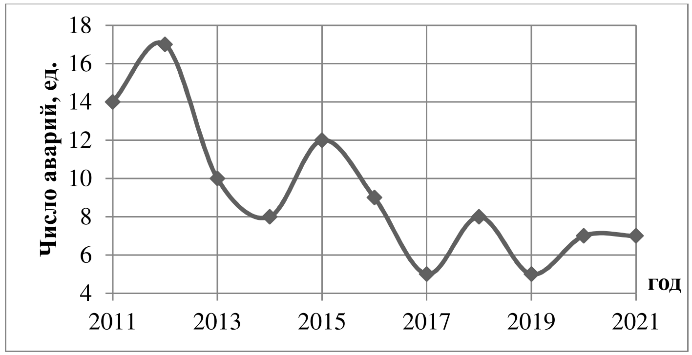 Рассмотрим статистические данные ПАО «Газпром», характеризующие число аварий, количество пострадавших в результате несчастного случая на предприятии. За рассматриваемый период с 2011 по 2021 год наблюдается тренд к снижению данных показателей, но сопровождающийся колебаниями, что усложняет моделирование и прогнозирование числа аварий и количества пострадавших (рисунки 1, 2).