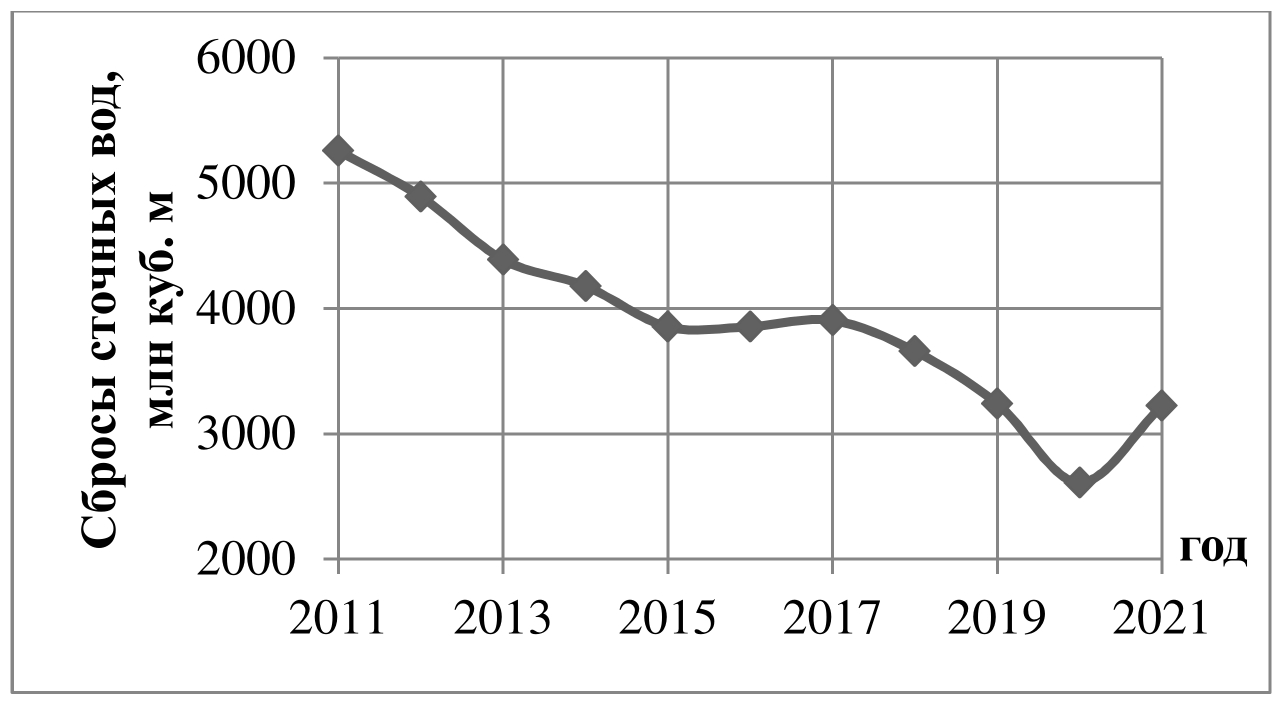Помимо показателей аварийности и пострадавших работников предприятий, деятельность промышленного комплекса сопровождается выбросом вредных веществ в атмосферу и в водные объекты. Рассмотрим динамику показателей, характеризующих объем сброса сточных вод за период с 2011 по 2021 год (рисунок 3).