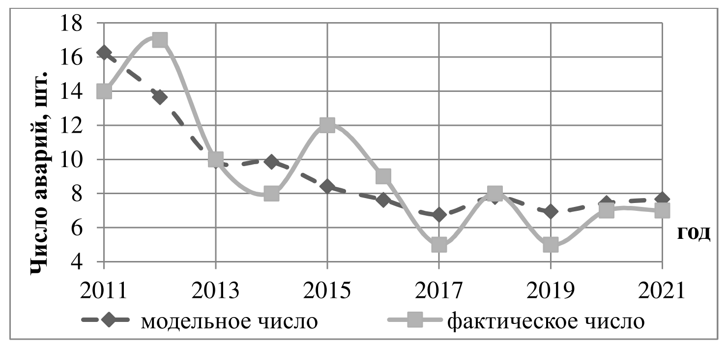 Рисунок 7 – Модельные и фактические значения для аварийности ПАО «Газпром»