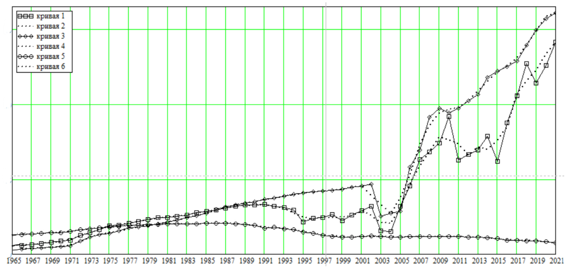 Fig. 2: Initial statistical data: 1 – output Y; 3 – volume of fixed assets K; 5 – labor resources L; dotted lines 2, 4, 6 – smoothed data.