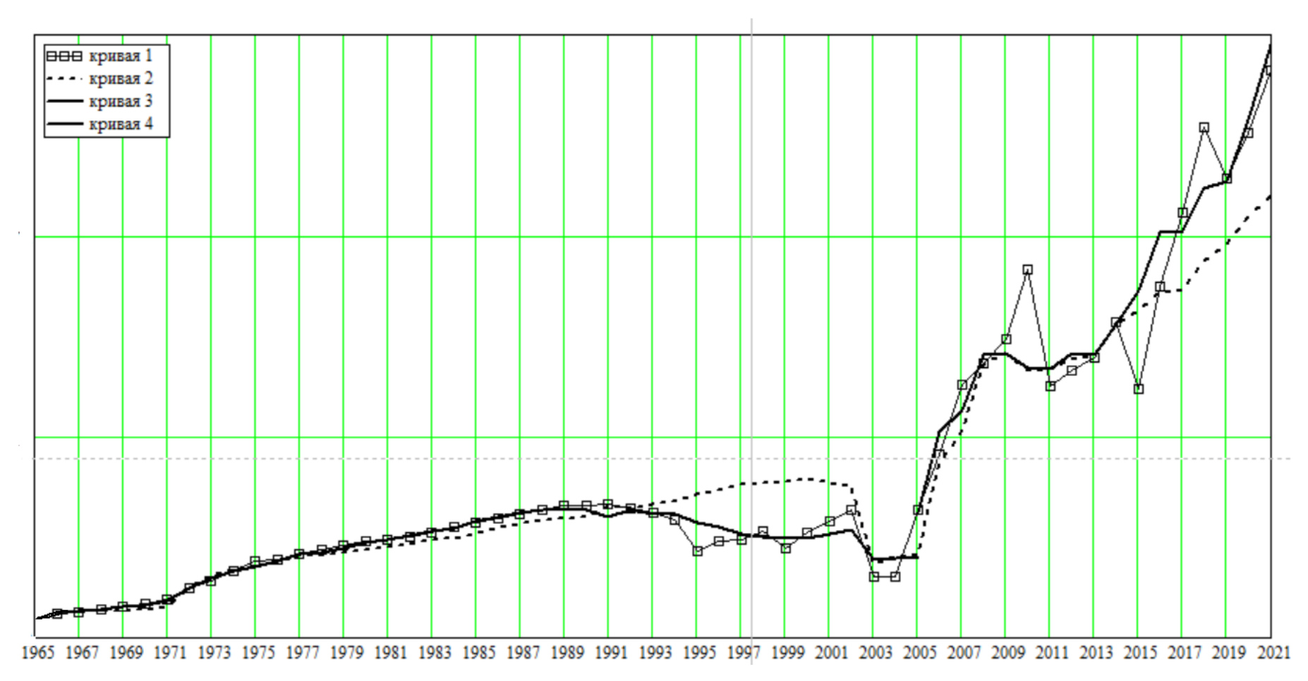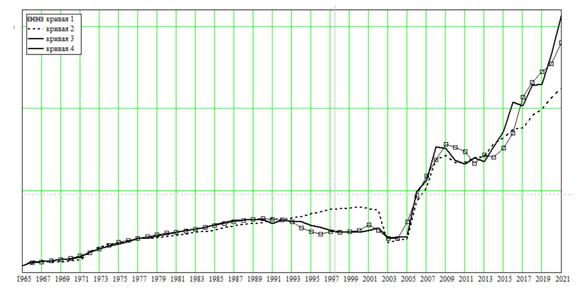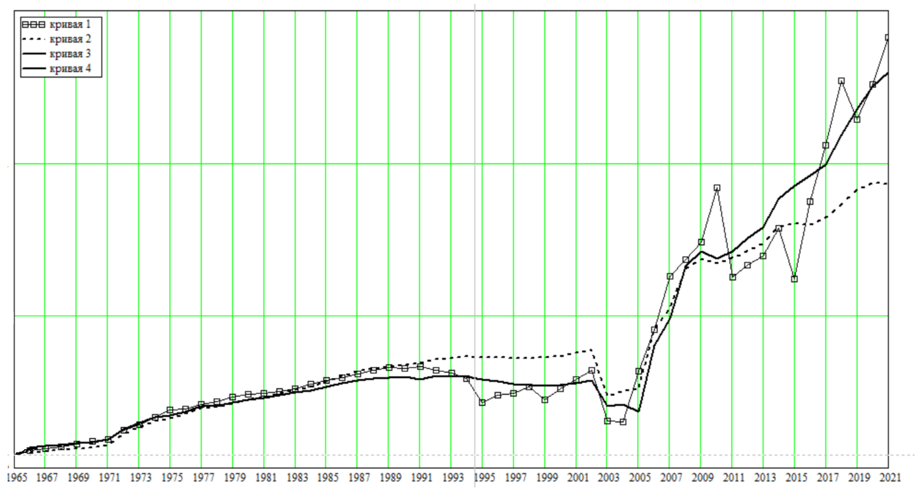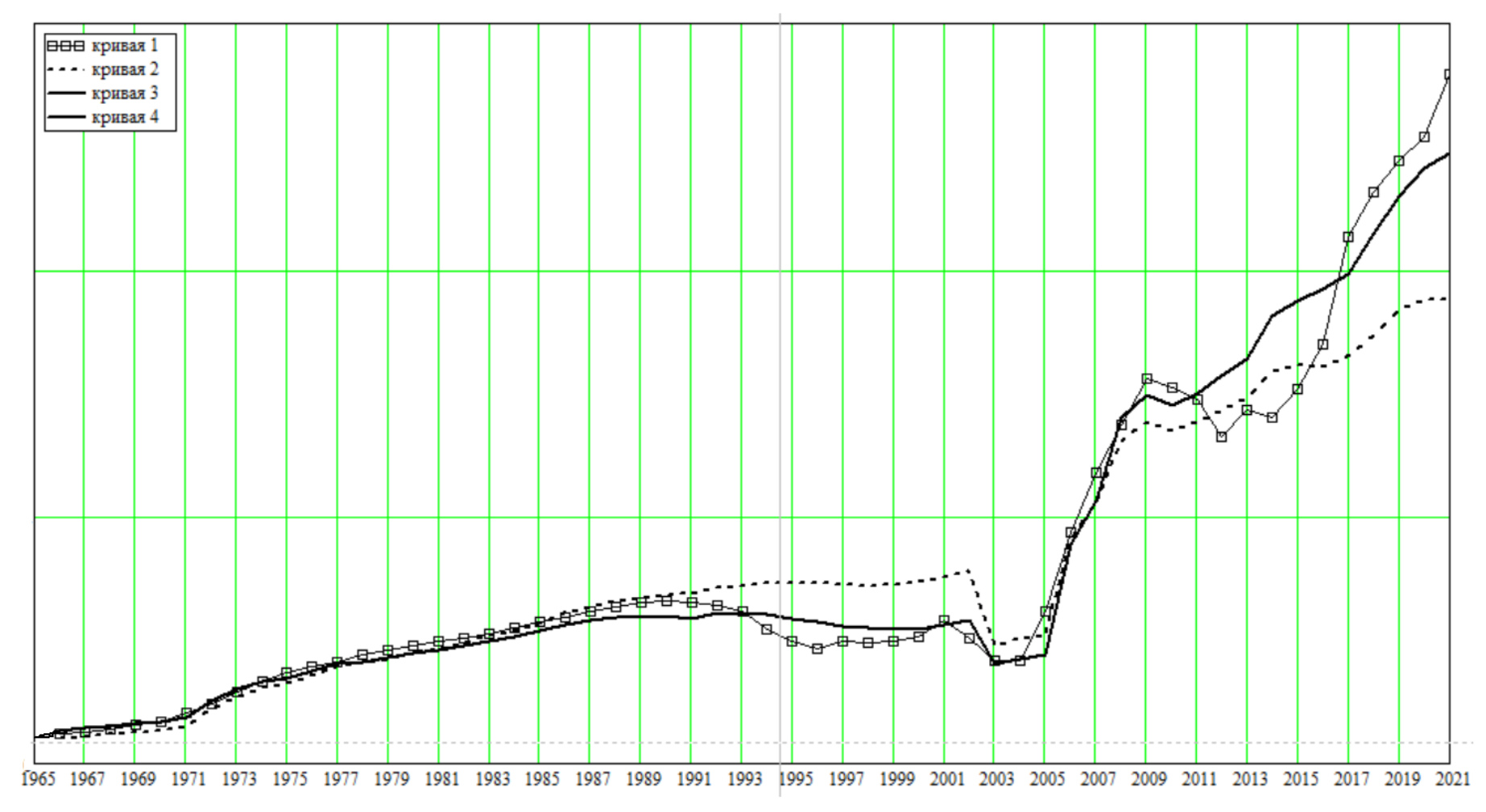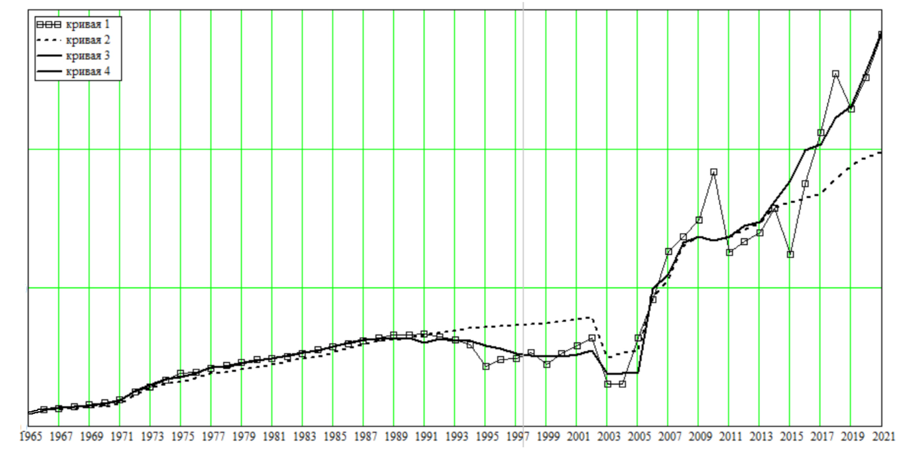 Для удобства введем обозначения для моделей, полученных на разных временных интервалах: полный период: 1965–2021 гг. – интервал ; первый период: 1965–2004 гг. – интервал ; второй период: 2004–2021 гг. – интервал .