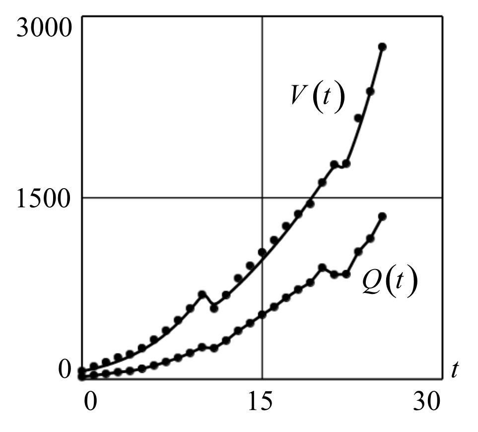 Рис. 3: Теоретические траектории динамики развития ВРП V(t) и производственного фактора региона Q(t), построенные по формулам (18) и (19). Точки соответствуют статистическим данным таблицы.