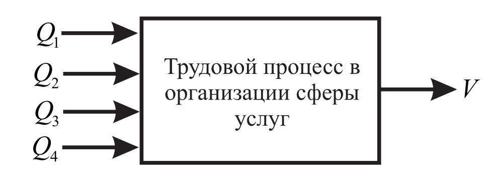 Моделируемый объект рассматривается как единое целое, без учёта его структуры, формы и способов организации производственных отношений. Связь между входными и выходным параметрами V = (Q₁,Q₂,Q₃,Q₄) может описана мультипликативной функцией вида
