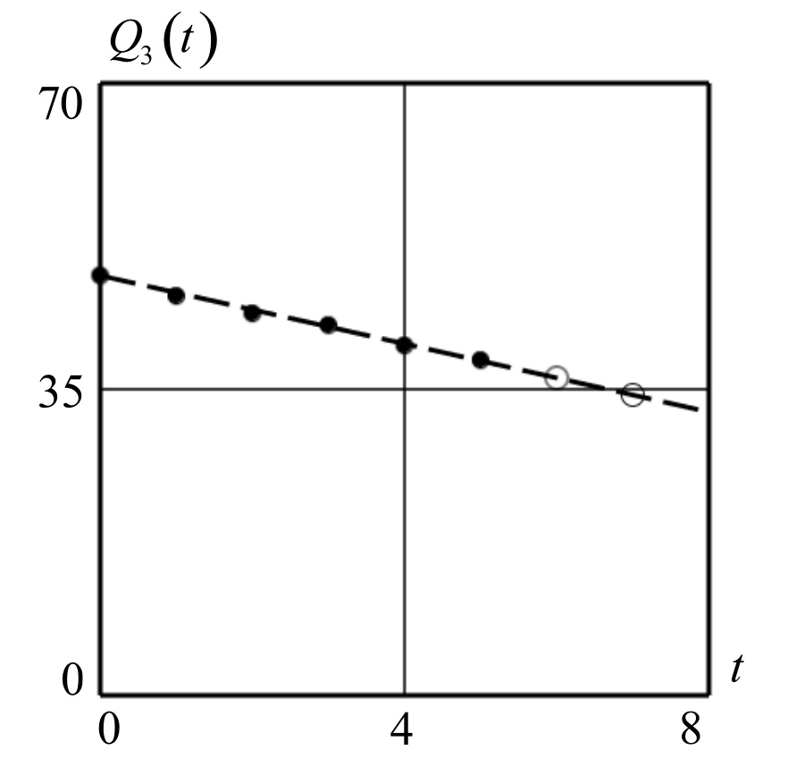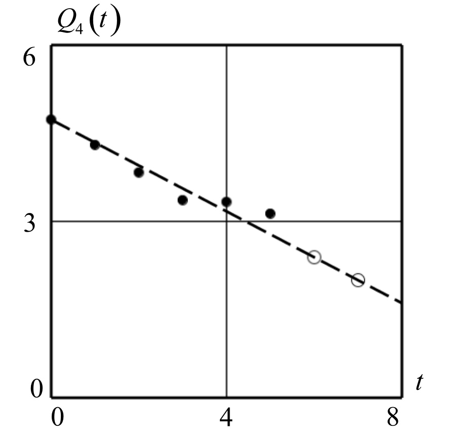 6. Fig. 5:  Comparison of the level of production stress of personnel Q₄(t) with statistical data from table 1. The dashed line is the trend line, black circles indicate the values corresponding to the initial data of Table 1, light circles indicate the forecast values of Q₄(t) for 2024 and 2025.