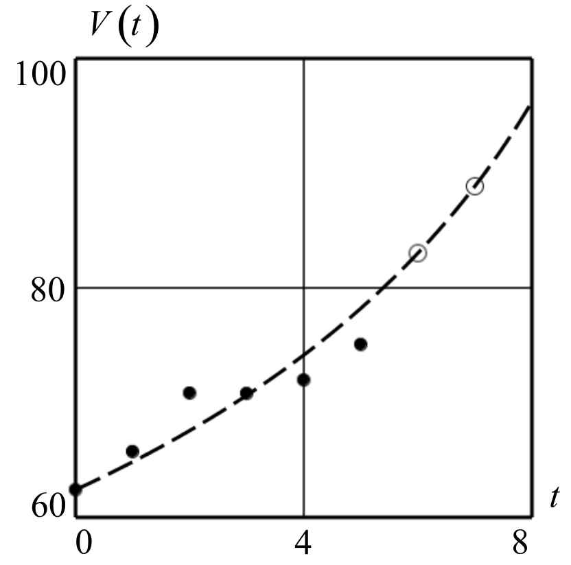 7. Fig. 6:  Comparison of the level of personnel satisfaction with work V(t) with statistical data from table 1. The dashed line is the trend line, black circles indicate the values corresponding to the initial data in Table 1, light circles indicate the forecast values of V(t) for 2024 and 2025.