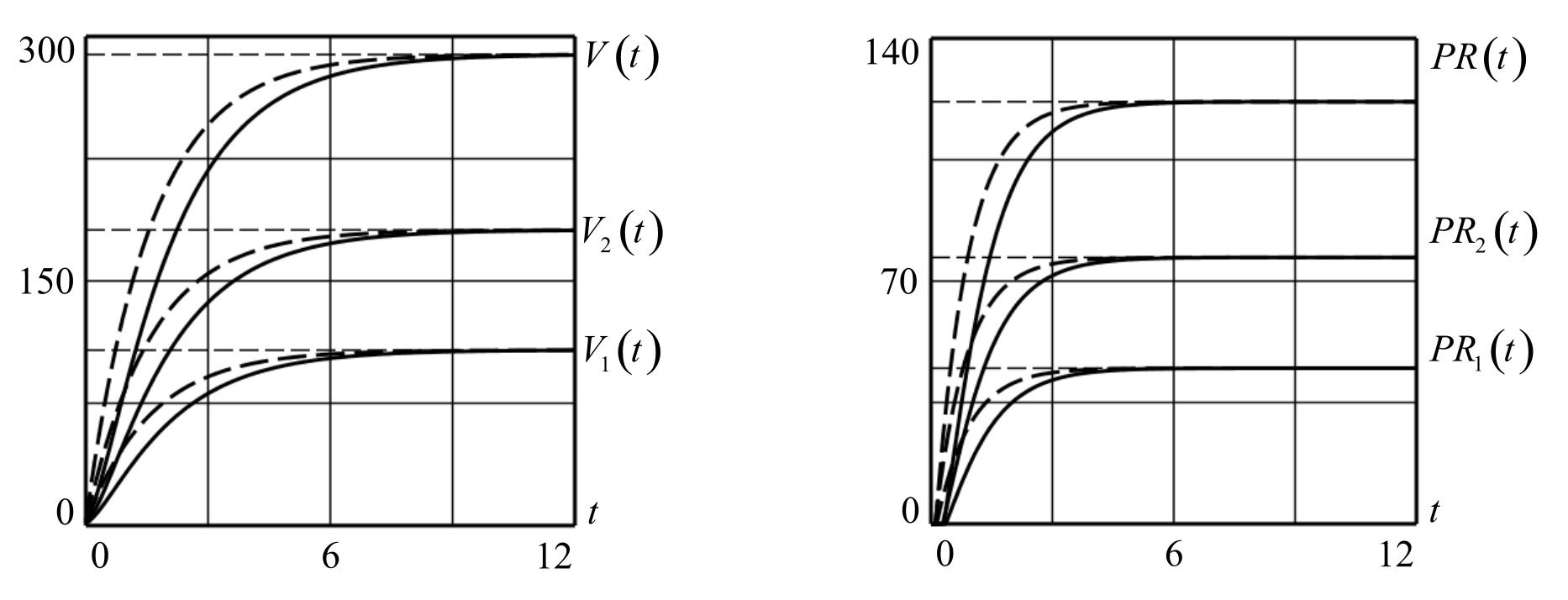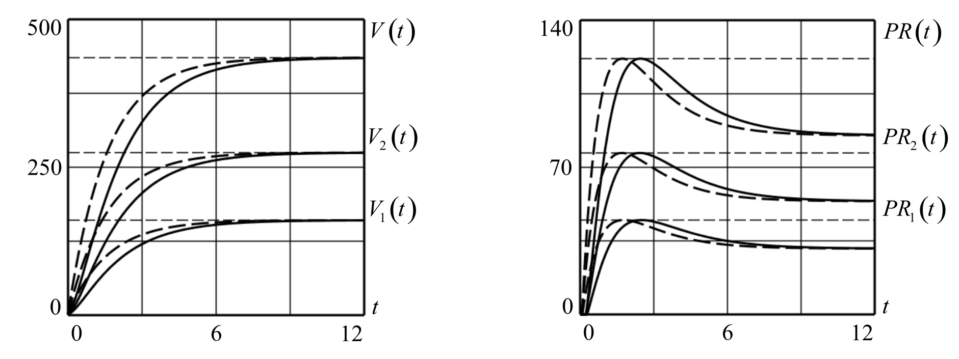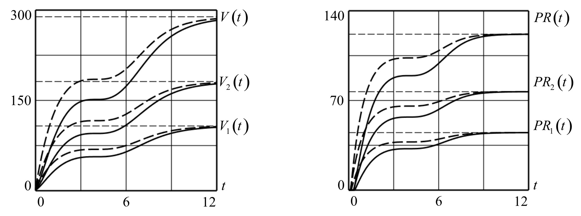 Сплошные линии соответствуют модели многопрофильного предприятия, учитывающей эффект запаздывания вложения внутренних инвестиций, штриховые линии соответствуют модели многопрофильного предприятия, не учитывающей эффект запаздывания вложения внутренних инвестиций [1]. Расчеты показывают, что модели не учитывающие эффект запаздывания привлечения внутренних инвестиций дают несколько завышенную оценку динамики развития предприятия.
