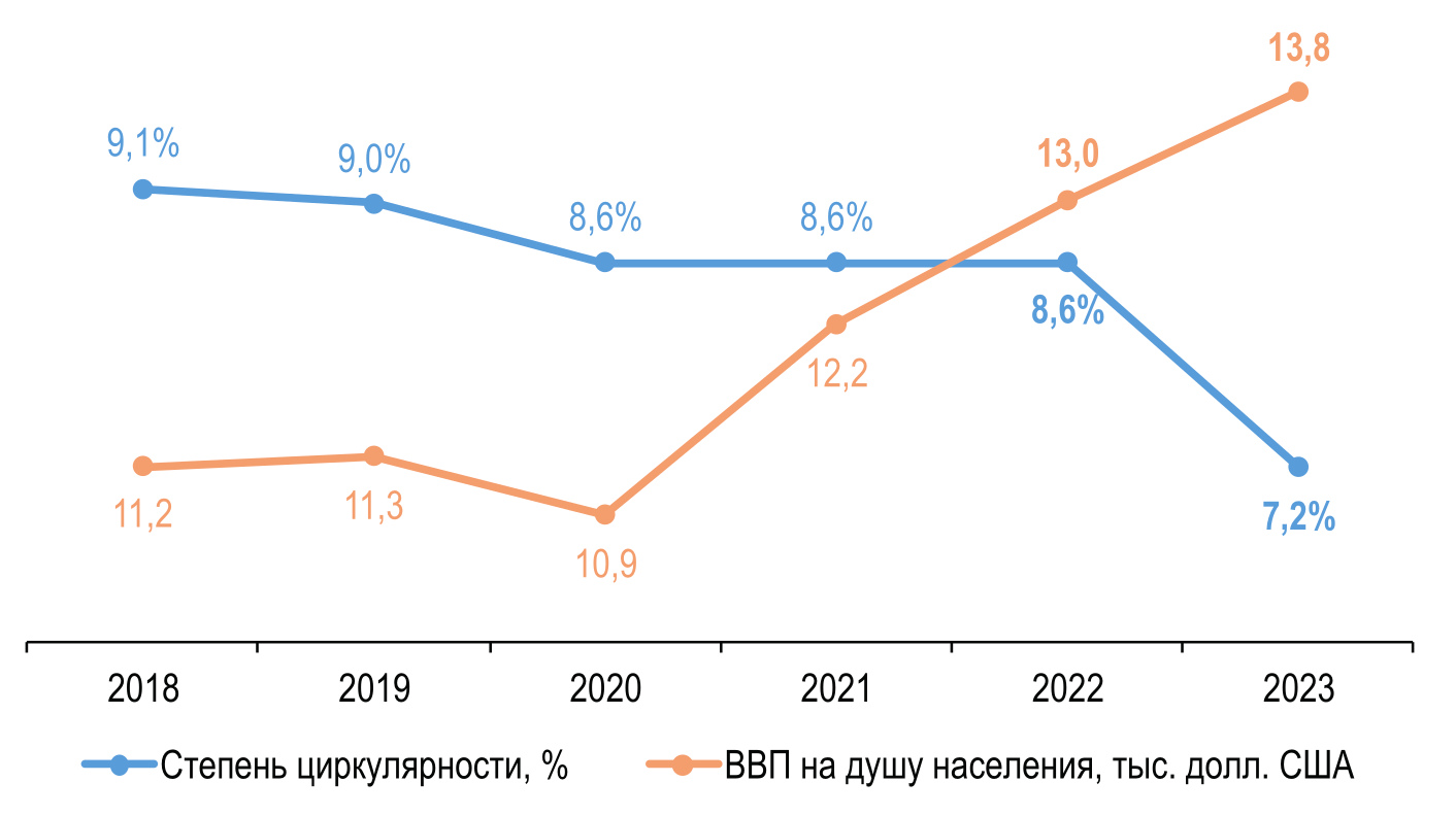 Так, при текущем темпе производства и потребления товаров и услуг для населения в 8 млрд. человек к середине XXI века будет необходимо троекратное количество ресурсов, которым владеет планета Земля [16]. Но, с ростом населения и уровня ВВП не происходит роста темпов степени циркулярности (цикличности) экономики – доли товаров и услуг, которая возвращается в экономику после завершения своего жизненного цикла [16] (рис. 2).