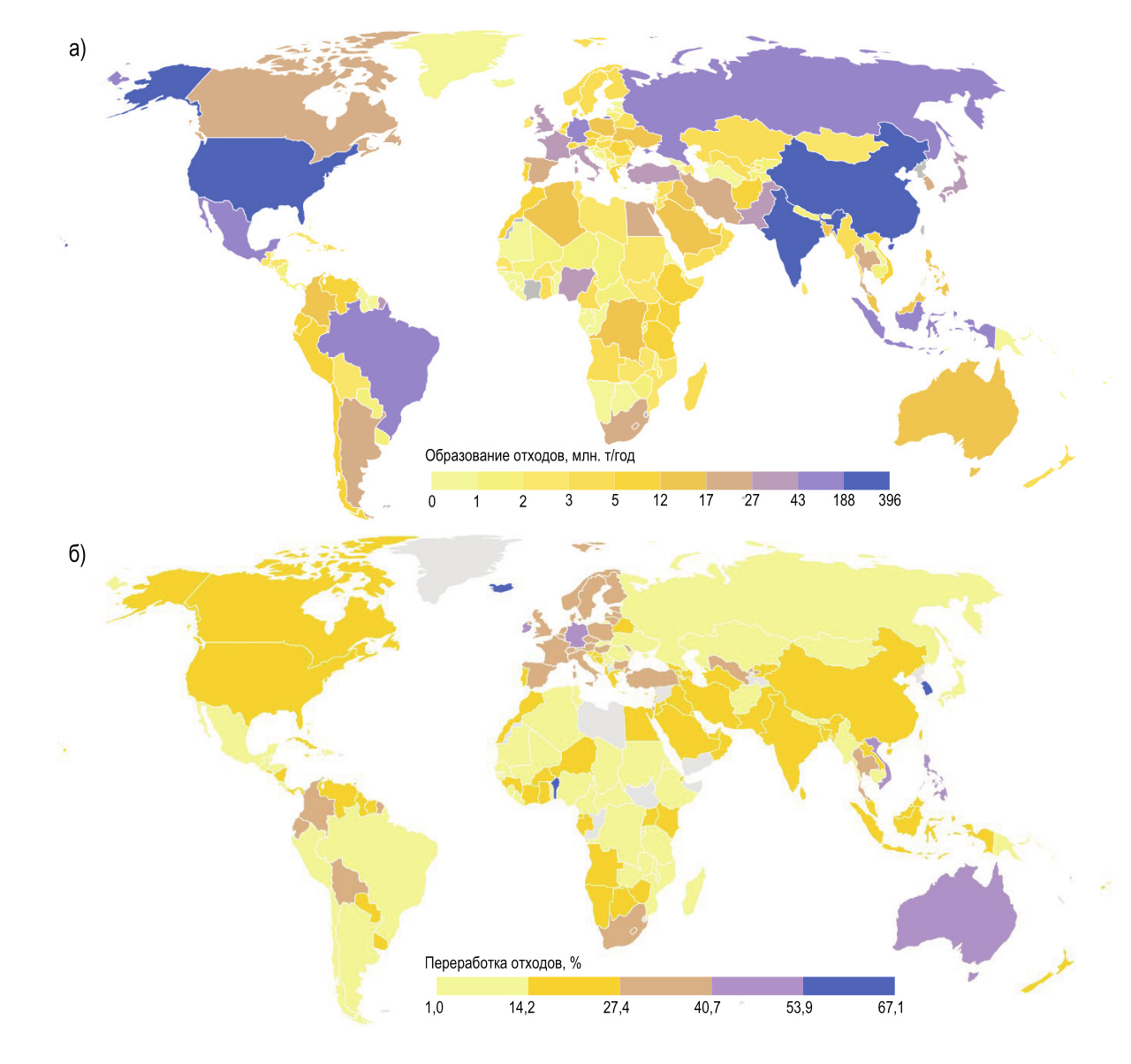 Рисунок 3: Распределение стран по образованию ТКО (а) и проценту их переработки (б) за 2022 год. Составлено авторами по данным источников [37, 38].