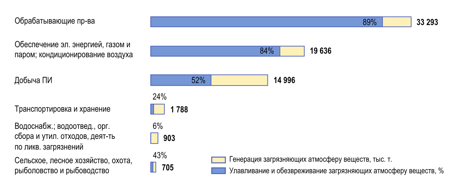Объем улавливания и обезвреживания выбросов загрязняющих атмосферу веществ в среднем за 2022 год составил 55,4 млн.т, что составляет 76,4% от суммарных выбросов (рис. 6). На обрабатывающие производства приходится на больший объем выбросов.