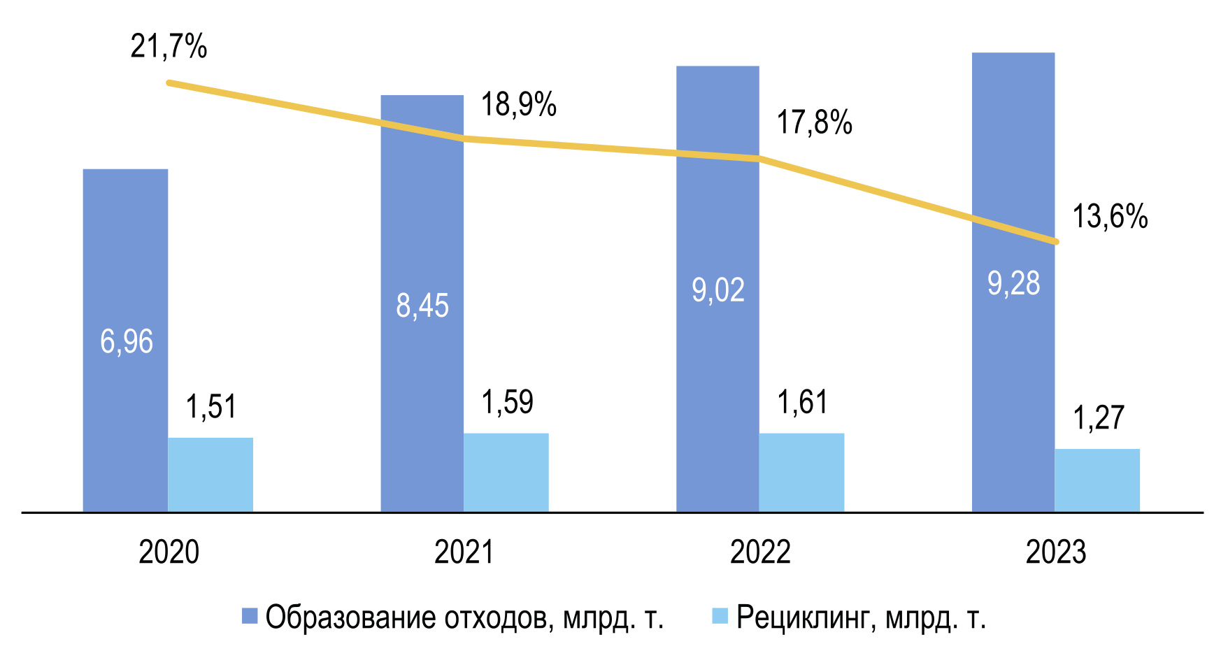Рисунок 7: Динамика образования и рециклинга отходов потребления и производств. Составлено авторами по данным источников Росприроднадзора.