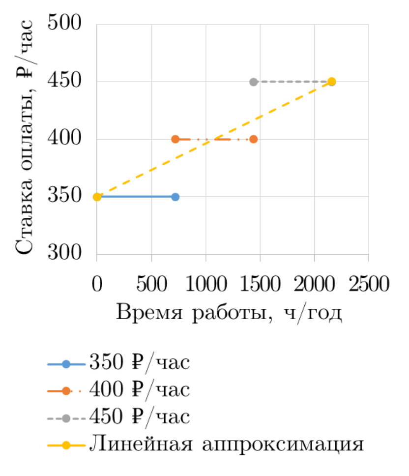 На Рис. 1 показана рассчитанная линейная аппроксимация зависимости результатов опроса минимально допустимой часовой ставки от количества отработанных часов в год
