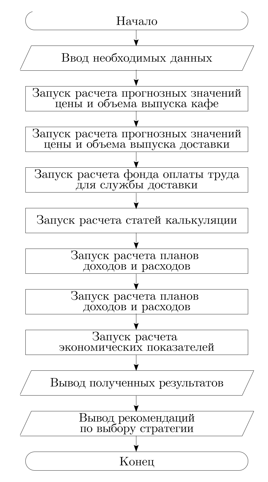 - Описан процесс проектирования информационной системы оптимизации деятельности предприятия общественного питания, включающий анализ действующего бизнес-процесса по покупке и доставке заказов клиентов, разработку стратегий по оптимизации действующего бизнес-процесса, разработку системы стимулирования персонала, анализ экономических показателей предприятия при различных стратегиях, разработку математической модели по максимизации прибыли предприятия и алгоритма работы информационной системы, а также сравнение показателей эффективности двух предлагаемых стратегий.
