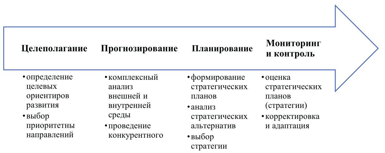 В основе методологии исследования лежит теория стратегического управления развития компаний в сфере промышленности, в рамках которой выделяют четыре основных этапа – целеполагание, прогнозирование, планирование, мониторинг и контроль (рис. 1).