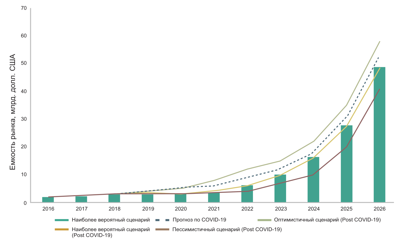 Рейтинговое агентство Market Research Future делает прогноз по объему рынка до уровня 35,5 млрд. долл. К концу 2025 года, а среднегодовой темп роста в 42,5% [2].