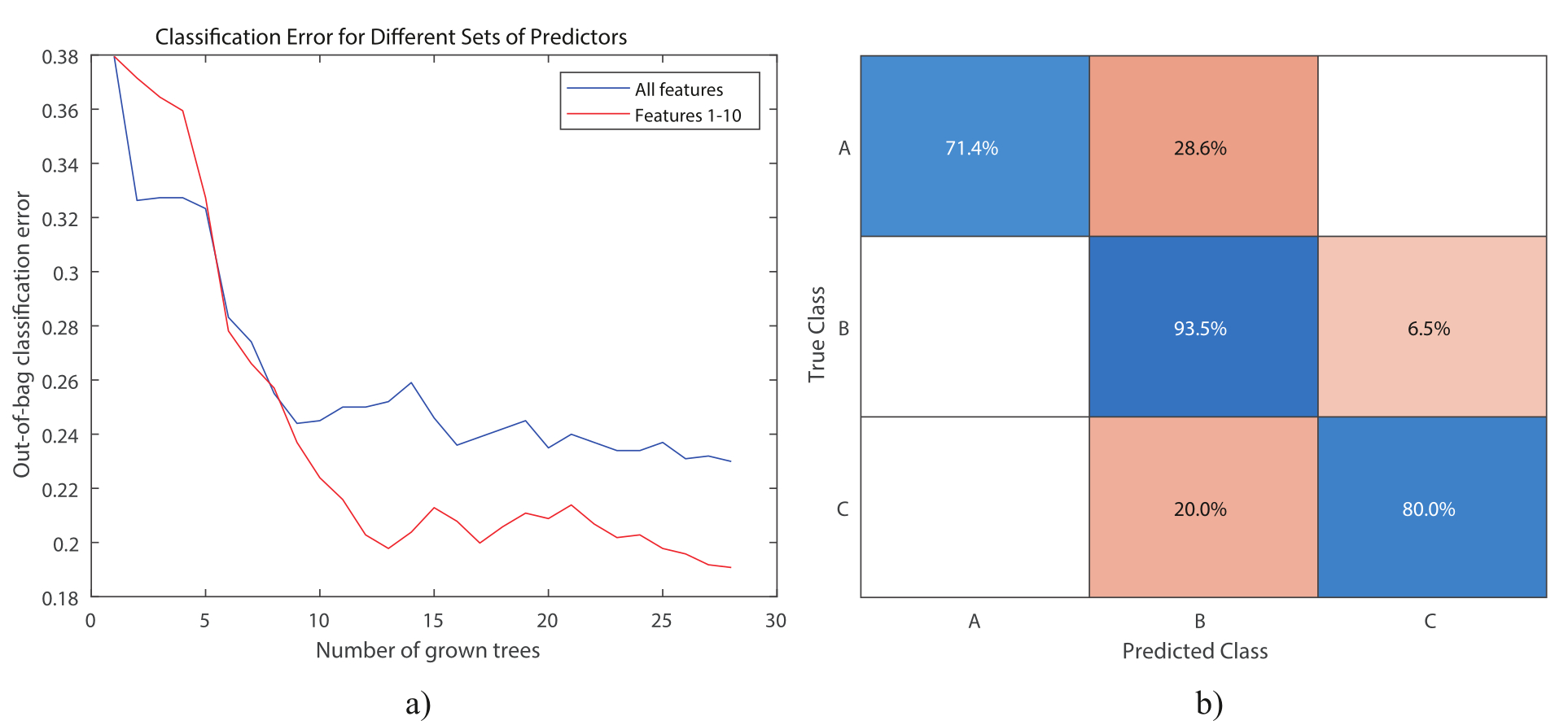 Fig. 4: Classification error for selected most important variables (a); normalized classification error matrix (b).