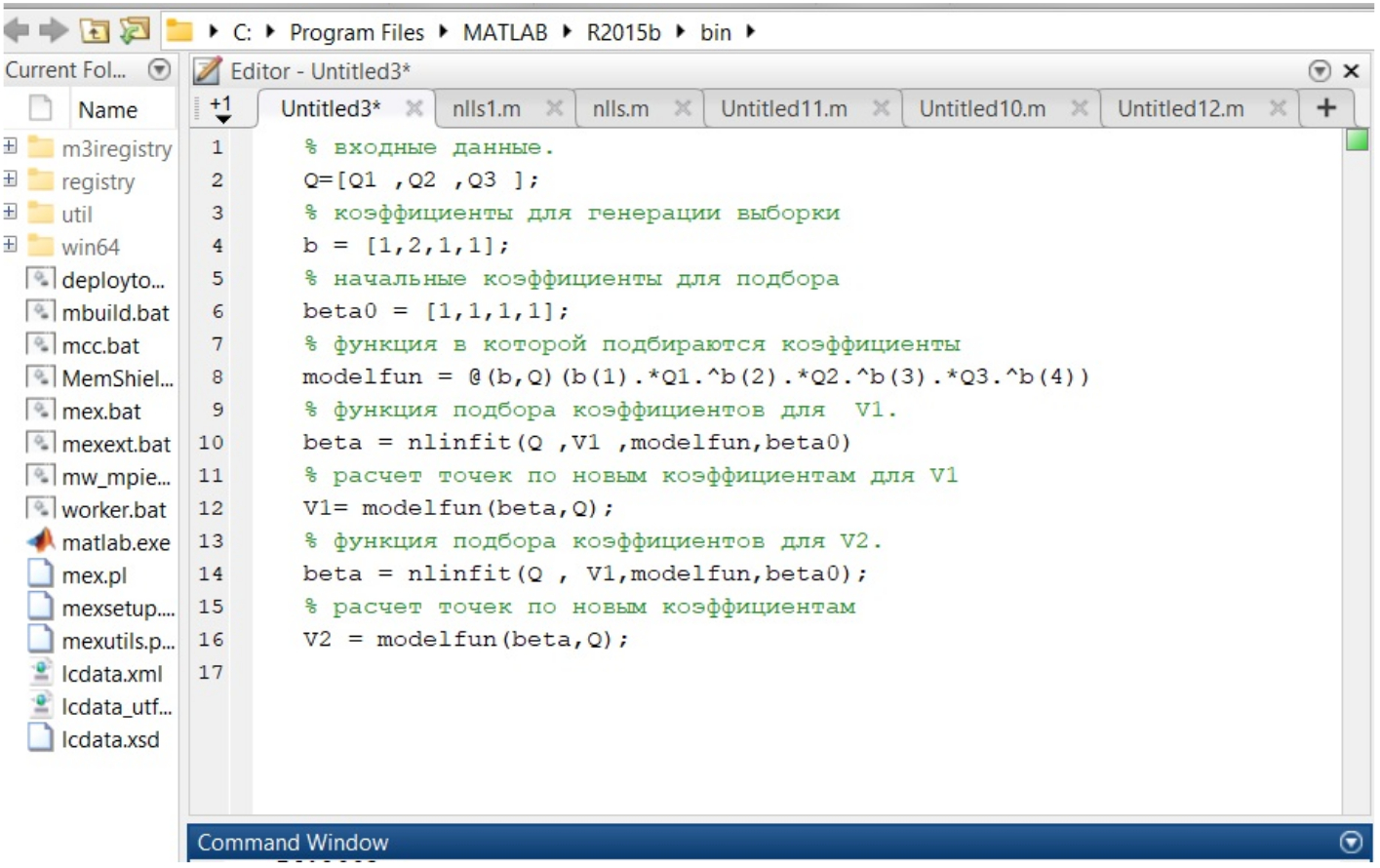 Параметры модели (6) и (7) идентифицируются нелинейной аппроксимирующей функцией nlinfit( ) в MATLAB [25, 26]. Далее на рис. 2 представлена часть программы в MATLAB, по которой производился расчёт.