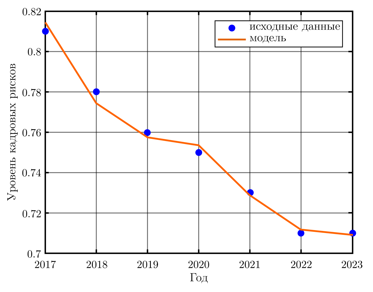 На рис. 3 и 4 и в табл. 11 представлено сравнение исходных и модельных данных с 2017 по 2023 годы по математической модели уровня кадровых рисков в области адаптации и обучения персонала — и показателя общего уровня кадровых рисков — .