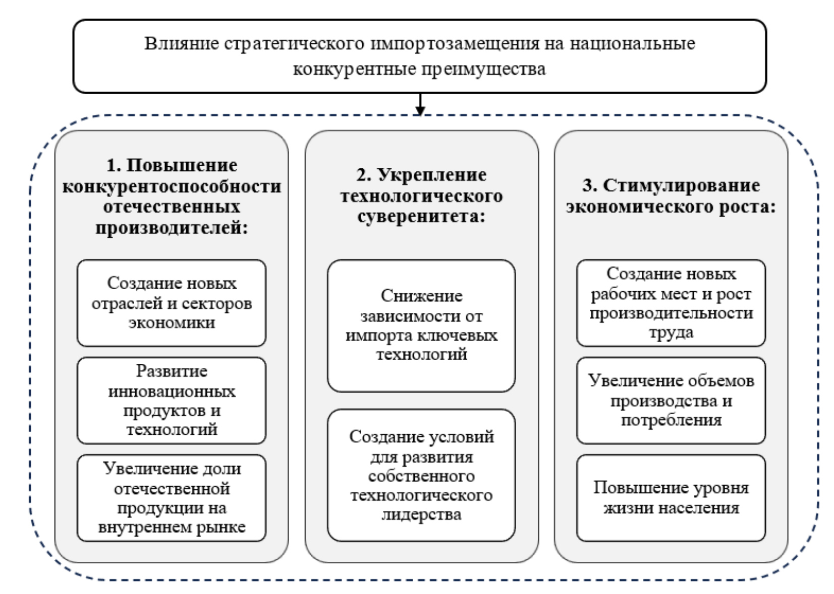 Таким образом, в ходе исследования было установлено, что стратегическое импортозамещение оказывает комплексное влияние на национальные конкурентные преимущества. Оно не только снижает зависимость от импорта, но и стимулирует развитие отечественного производства, инноваций и технологий, что приводит к повышению конкурентоспособности экономики на глобальном уровне, укреплению технологического суверенитета и улучшению качества жизни населения.