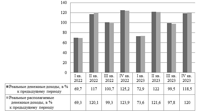 Индексы реальных денежных доходов и реальных располагаемых доходов населения имеют тенденцию к снижению в первом–третьем кварталах и рост во втором–четвёртом кварталах. Это объясняется индексацией страховых и социальных пенсий во втором–четвёртом кварталах ежегодно, повышением минимального размера оплаты труда. К последнему показателю привязаны многие социальные пособия.