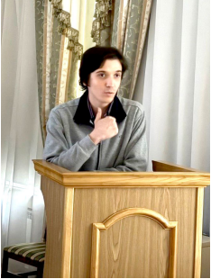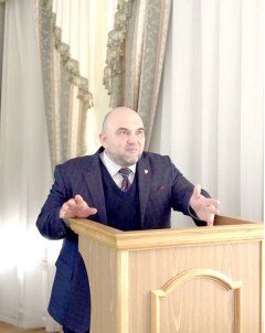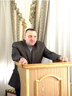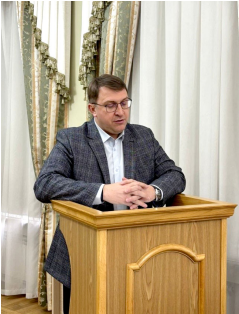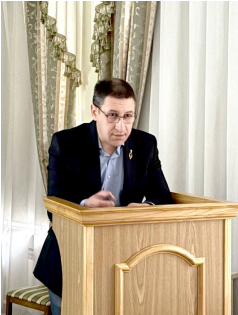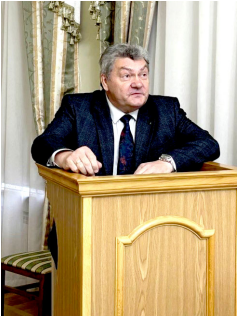 Рис. 1. Президиум мероприятия; слева направо: И. И. Кротт, Д. И. Петин (выступает), Г. И. Растягаева