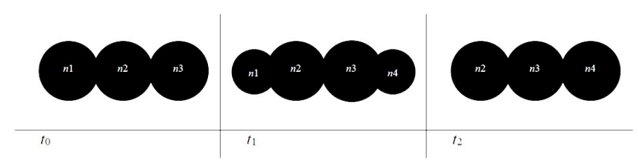 Здесь нас интересует следующее свойство. Допустим, изначально фигура состоит из частей n1, n2, n3. Часть n1 начинает исчезать, и этот же момент справа формируется новая часть n4. Следовательно, в какой-то момент и на некоторый миг фигура будет состоять из частей n2, n3, n4; а после из исчезающего n2, стабильного n3 и n4, а также зарождающегося n5. Спустя некоторое время мы застанем эту же фигуру, но состоящую уже из частей n68, n69, n70 (Рис. 1).