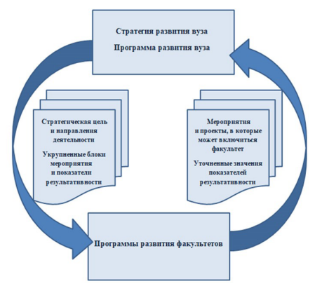 С другой стороны, управление в высшем учебном заведении осуществляется в большой степени на федеральном уровне и имеет высокий уровень контроля и, несмотря на то, что российские высшие учебные заведения могут иметь собственную концепцию развития, они прочно вписаны в систему государственного управления. Таким образом, стратегии для российских вузов во многом определяются извне. Исходя из вышесказанного, можно сделать вывод о том, что стратегия вуза должна быть гармонизирована со стратегиями научно-технического развития РФ; пространственного развития РФ; социально-экономического развития соответствующих субъектов РФ, а также учитывать приоритеты, прописанные в национальных проектах. Так как дополнительное финансирование, привлекаемое в вуз благодаря участию в национальных проектах, является не только ресурсом для развития, то дополнительное финансирование дает некоторую свободу действий руководящему органу вуза, а принятый стратегический документ является легитимным основанием для принятия решений и изменений.