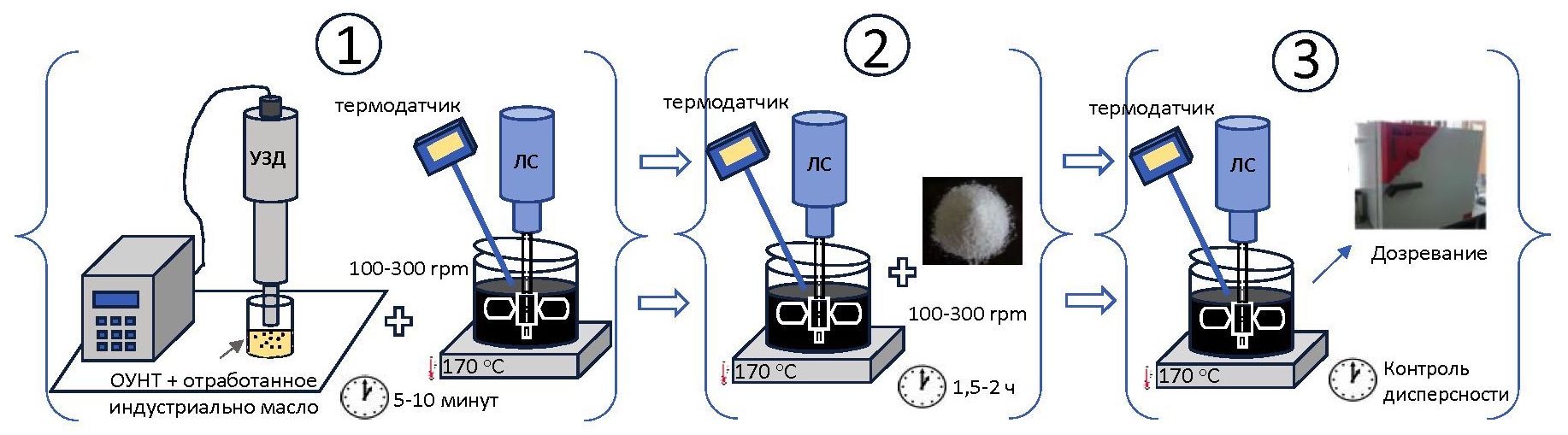 Методика приготовления наномодифицированного полимерно-битумного вяжущего. В ходе выполнения ряда поисковых экспериментов, включающих контроль потерь наномодифицированных дисперсных систем «пластификатор – углеродные нанотрубки» при пробоподготовке, использование различного оборудования для отвешивания компонентов, различные технологические этапы объединения компонентов полимерно-битумного вяжущего, были установлены оптимальные технологические параметры приготовления полимерно-битумных вяжущих с наномодифицированными дисперсными системами, обеспечивающие получение статистически значимых результатов (рис. 1).