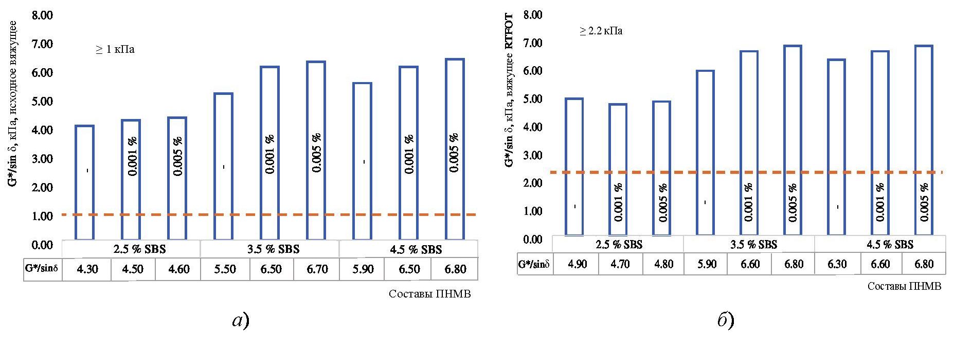 Сдвиговая устойчивость G*/sinδ для несостаренных образцов должна быть не менее 1,0 кПа, а для образцов, подверженных кратковременному старению по методу RTFOT, – 2,2 кПа. Данные рисунка 3a демонстрируют, что в образцах ПБВ с содержанием полимера 3,5 % введение одностенных углеродных нанотрубок в количестве 0,001 и 0,005 % (составы № 5 и № 6) позволяет улучшить сдвиговую устойчивость до 21 %. Дополнительно к этому ОУНТ дают возможность получить более прочную и стабильную структуру ПНМВ к краткосрочному процессу старения. Так, после старения по методу RTFOT сдвиговая устойчивость для этих образцов не изменилась.