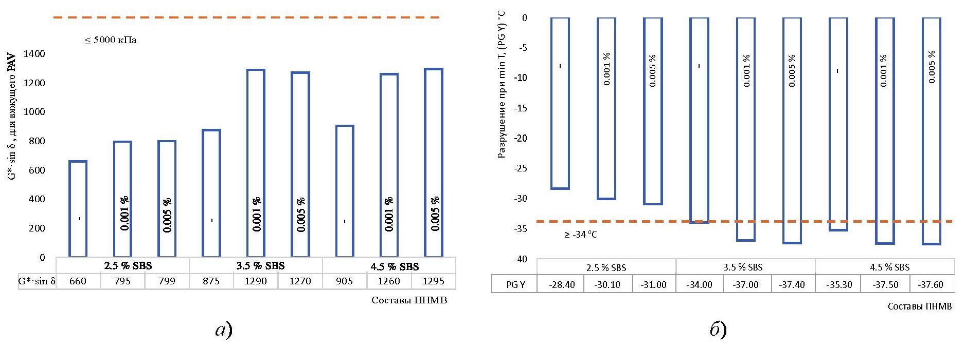 Модифицирование углеродными нанотрубками ПБВ позволяет улучшить показатель усталостной устойчивости (рис. 6а) до 47 % (состав № 5). Это свидетельствует о том, что после воздействия долгосрочного старения PAV модифицированное вяжущее способно эффективно проявлять свойства вязкоупругого материала и восстанавливаться после снятия нагрузки. Это характеризует вяжущее как систему с устойчивой к процессам долгосрочного старения полимерной сеткой, усиленной одностенными углеродными нанотрубками. Улучшились также и температурные эксплуатационные свойства модифицированных вяжущих с PG-22 до PG-34 при содержании полимера 3,5 % и ОУНТ 0,001 и 0,005 % (составы № 4, 5 и 6), что дополнительно подтверждает, что ОУНТ оказывает значительное влияние на улучшение эксплуатационных свойств при отрицательных температурах (рис. 5б).