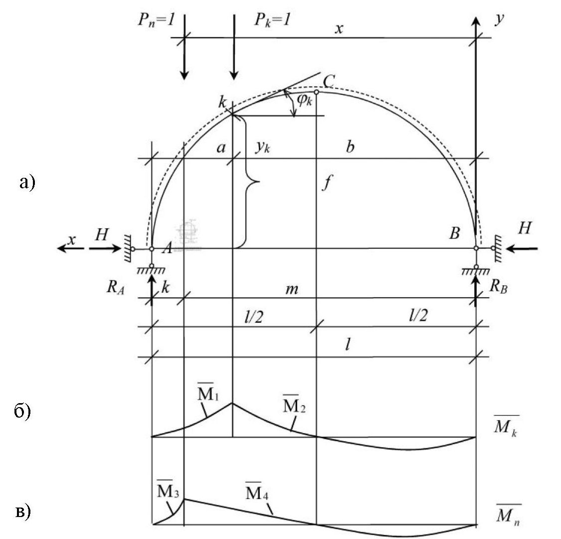 Рис. 2. Исходная расчетная схема трехшарнирной арки для определения усилий при (а); эпюра моментов от действия единичной силы Рk = 1, приложенной в сечении k (б); эпюра моментов от действия единичной силы Рn = 1, приложенной в произвольном сечении n (в)