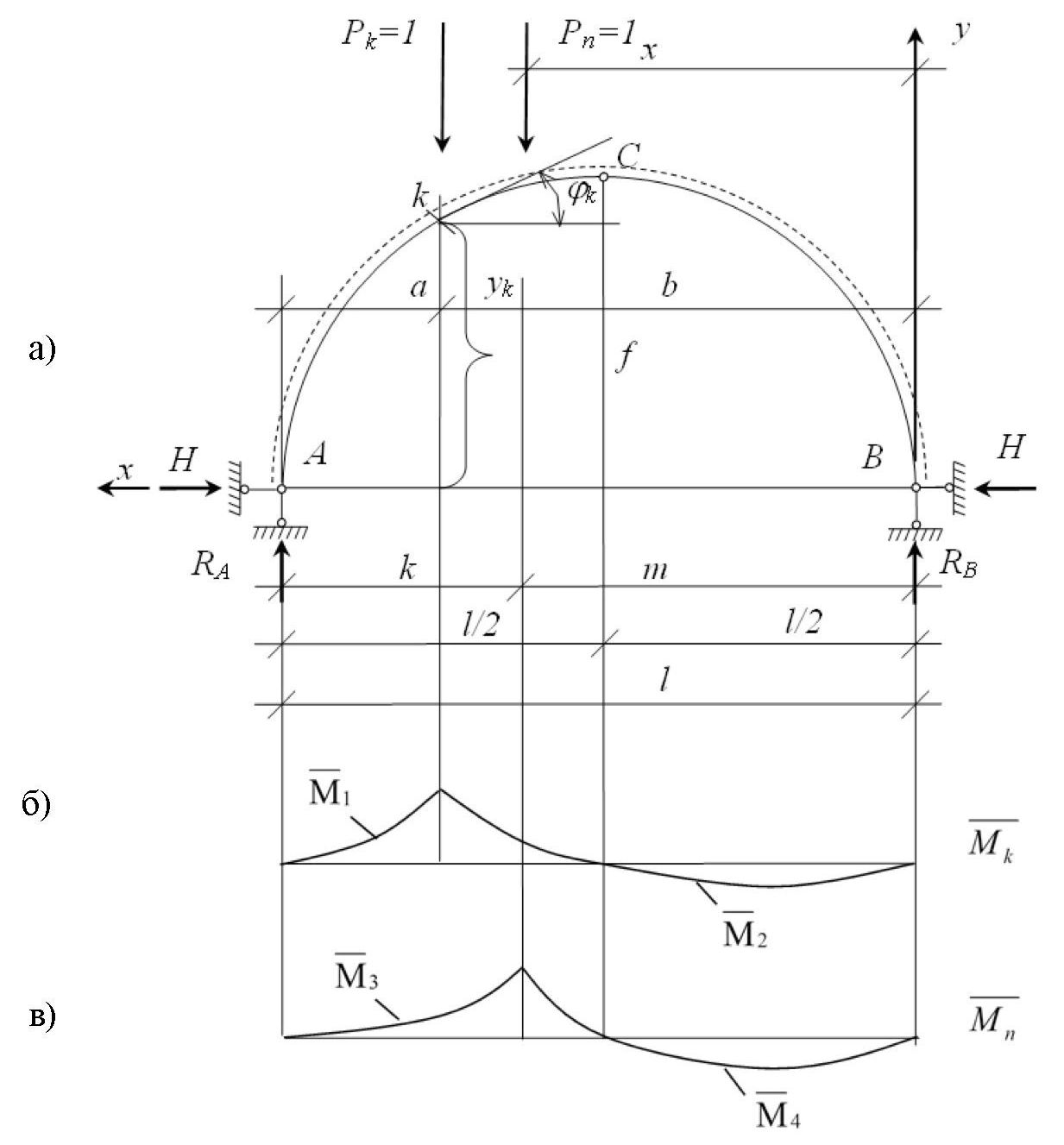 Рис. 1. Исходная расчетная схема трехшарнирной арки для определения усилий при в ≤ x ≤ l (а); эпюра моментов от действия единичной силы Рk = 1, приложенной в сечении k (б); эпюра моментов от действия единичной силы Рn = 1, приложенной в произвольном сечении n (в)