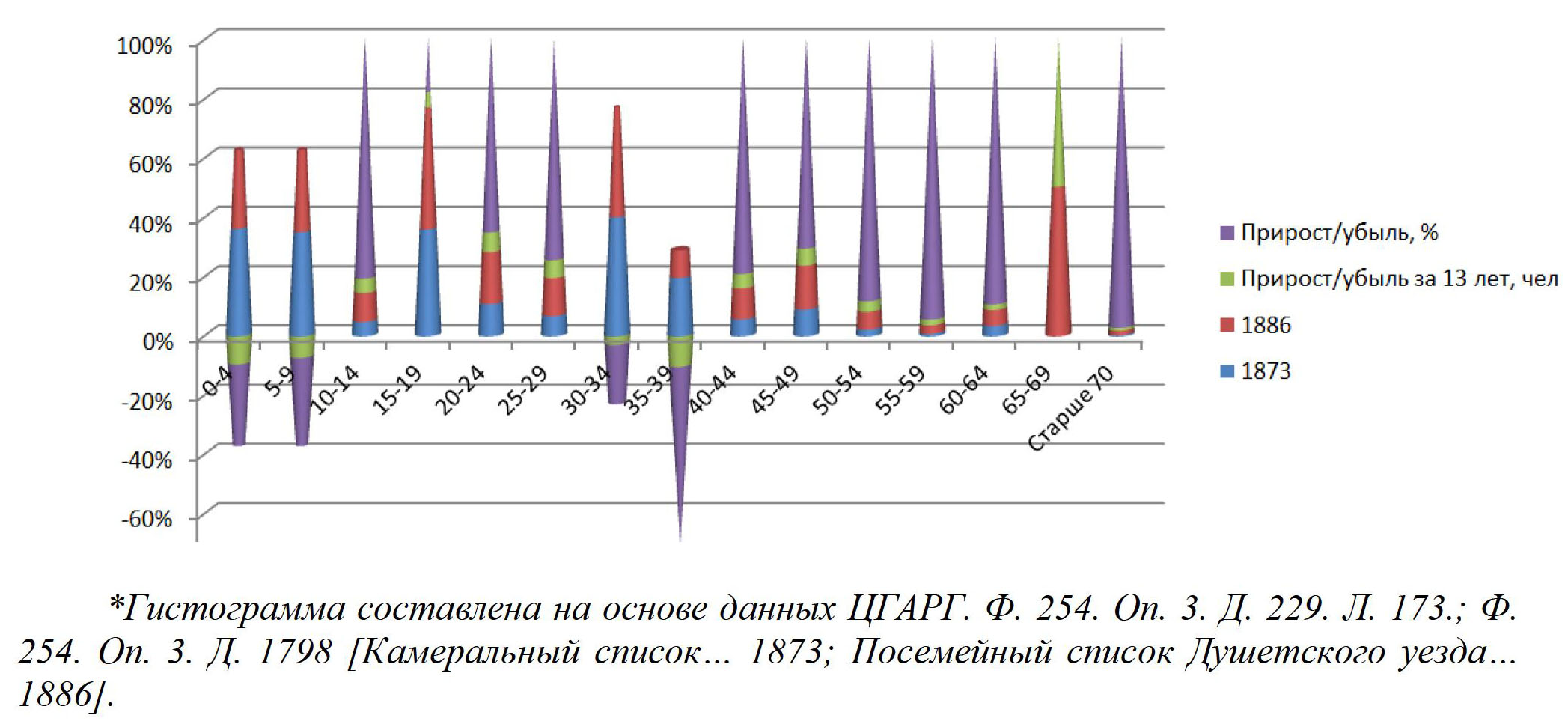 * Гистограмма составлена на основе данных ЦГАРГ. Ф. 254. Оп. 1. Д. 1245. Л. 3. без учета числившихся погибшими на момент переписи.