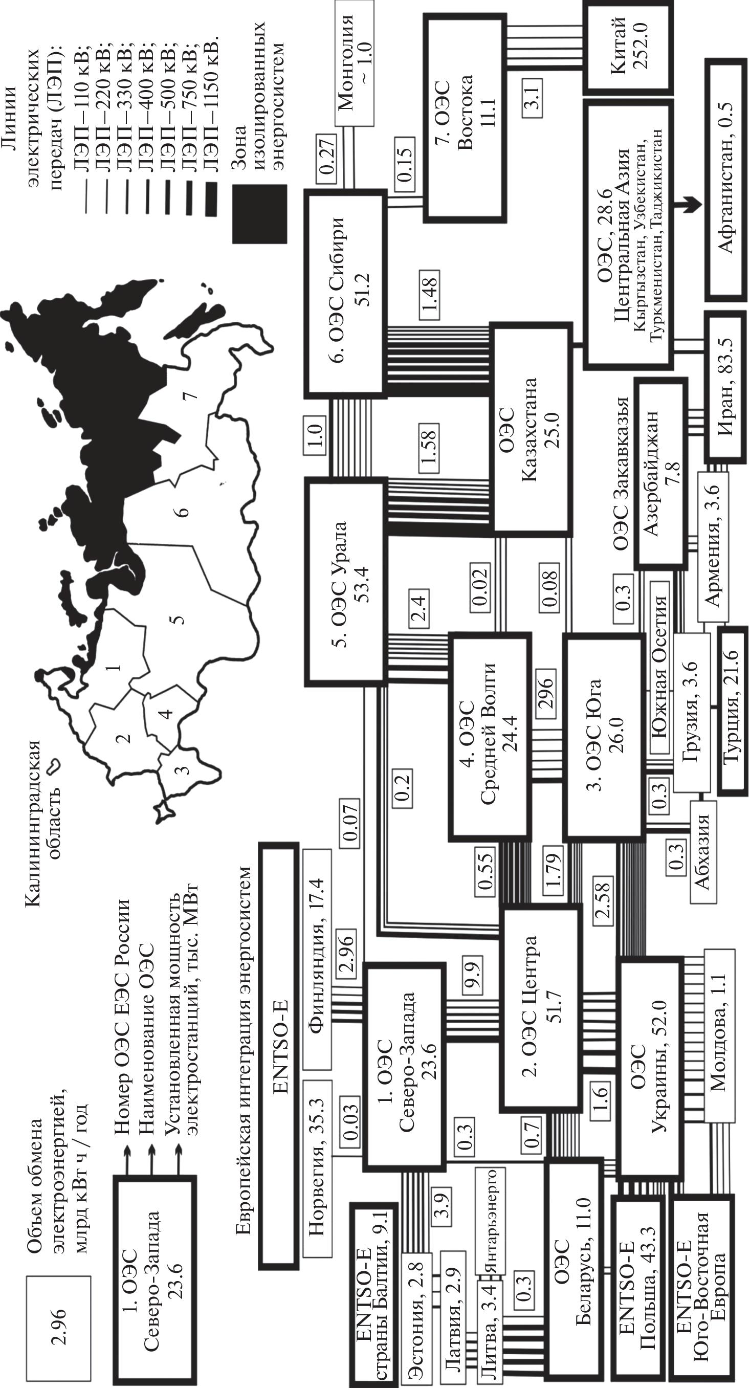 The article examines the Unified Energy System of Russia from the point of view of its modern content and connectivity of structural parts. It is shown how the patterns of development of the USSR and Russia’s energy space are historically connected. The main attention is paid to the geographical analysis of changes in the industrial space of Russia, which determines the bet on factual information. The study revealed that there are three structural parts in the Unified Energy System of Russia. According to the criterion of the absence of electrical connections for parallel operation with other systems, a zone of technologically isolated (decentralized) energy systems is allocated, this is by definition the area of network incoherence. According to the criterion of synchronous operation (with a common frequency of electric current), two more spatial zones are allocated. The first synchronous zone includes six integrated power systems. Geographical analysis shows that elements of weak communication are inherent in all power systems and are produced by the transformation of the post-Soviet space. A pronounced defect of network incoherence is Kaliningrad oblast. The energy system of the South is based on the transit of electricity through the territory of Ukraine. The disconnection will reduce the stability of the European segment of the Unified Energy System of Russia, the risks of losing operational access to Transnistria, Moldova and the south-western segment of the European energy system are high. Therefore, capital-intensive network projects bypassing Ukraine are relevant. The energy system of the Urals provides the Center–Siberia link with transit through Kazakhstan and, as a consequence, network incoherence and the risks of losing access to Central Asia. The second synchronous zone of the Unified Energy System of Russia includes one unified energy system of the East, which operates in parallel, but not synchronously with the first zone (weak network connection). The energy system of the East has a narrow spectrum of intersystem communication, but it is very promising for integration with the energy system of China.