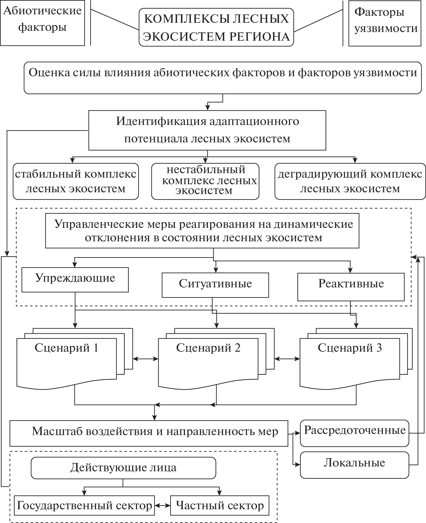 Correlations between the quantitative values of abiotic factors associated with climate change and the criteria for the vulnerability of forest ecosystems for 24 model subjects of the Russian Federation have been established. A high degree of closeness of the relationship between climatic parameters and forest fires was revealed for forest ecosystems in the Center and the South of Russia, as well as Eastern Siberia. Using a matrix model for positioning the adaptive potential of a single regional forest ecosystem, clusters with the most vulnerable to climate change groups of regional forest ecosystems were identified. The application of the developed methodology for the analysis of regional complexes of forest ecosystems made it possible to establish that there is a shift in the indicators of their adaptive potential to the lower limit of their sustainability (Arkhangelsk, Leningrad, Voronezh, Tyumen, Irkutsk oblasts, Khanty-Mansi Autonomous Okrug, Khabarovsk krai). Based on the study and clustering of model federal subjects according to the level of adaptive potential, differentiation of management decisions and forestry measures for enlarged territorial objects, including various federal subjects, was carried out in order to maintain and strengthen the adaptive potential of forest ecosystems. Measures for adapting forest ecosystems to climate change can be implemented in the context of three scenarios: forest management with elements of reactive adaptation to climate change for stable forest ecosystems, implementation of the forestry adaptation strategy to climate change for unstable forest ecosystems and restoration and maintenance of ecosystem functions of forests for degrading forest ecosystems.