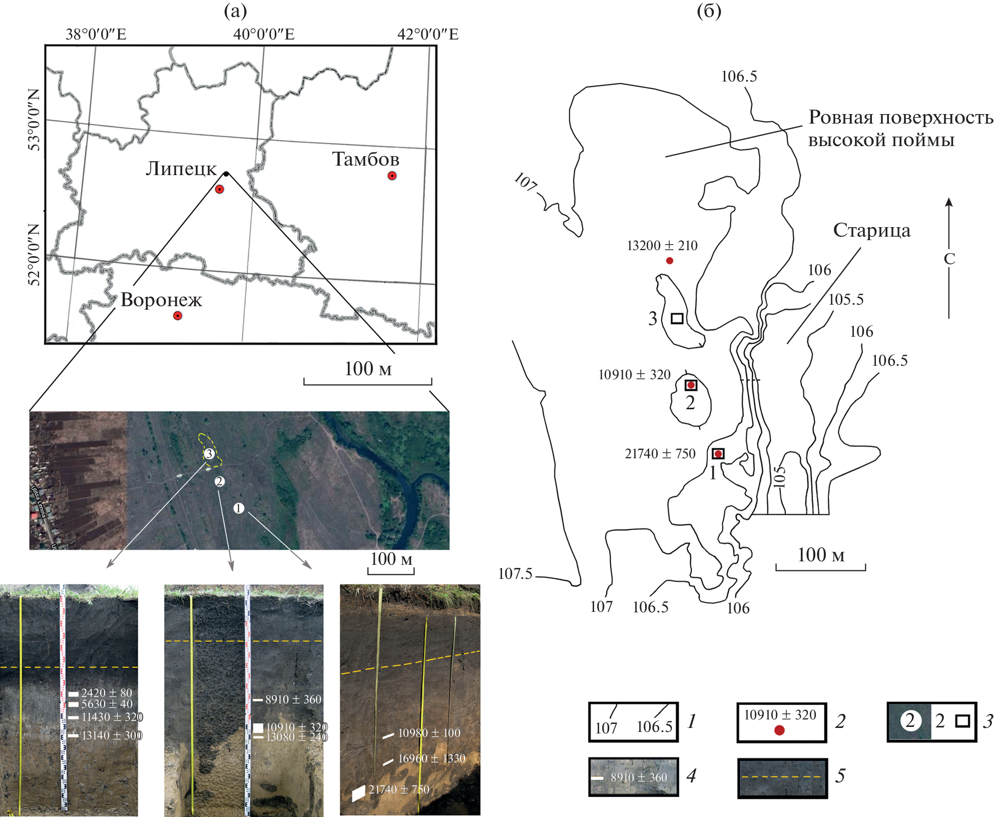 The results of paleosol and paleogeographic reconstructions on the new key site “Bol’shaya Kuzminka” within the northern part of the forest-steppe zone of the East European Plain (the high floodplain of the Vorone-zh River, the northern outskirts of the Bolshaya Kuzminka village, Lipetsk Oblast) are presented. To determine the age of alluvial deposits at different depths within the soil profiles, we used archaeological artefacts, Pleistocene faunal remains, soil humus, and charcoal. We reconstructed two main stages of floodplain formation during the Holocene: the early phase of low-intensity alluvial accumulation (beginning of the Holocene to the end of the Atlantic period, with mean rate of sedimentation–0.6 cm per 100 yr) and the late phase of increasing alluvial sedimentation (the second part of the Holocene, with mean rate of sedimentation–1.3 cm per 100 yr). Analysis of a closed depression within the floodplain allowed to reconstruct a complex synlithogenic soil profile with relic traces of three paleosols: a dark-colored Chernozem-like paleosol of the first half of the Holocene, the Luvisol of the Subboreal climatic phase (Gray Forest Soil), and the Stagnic Phaeozem (Chernozem-Meadow Soil) of the Subatlantic climatic phase of the Holocene. Flat areas around depressions hosted grassland vegetation; Stagnic Phaeozems (Meadow-Cheronozem soils) were formed here during the entire Holocene synchronic with alluvial sediments’ deposition. Palynological analysis of floodplain soils and deposits indicated that forests developed in the trend of widespread their areas on adjacent watersheds since the beginning of Subboreal period. Anthropogenic impact on soils and plant cover was noticeable from the Subatlantic period, and its intensity was increasing over time. Introduction of anthropochores was the main anthropogenic signal that resulted from utilizing floodplains and gullies as pastures and ploughlands.