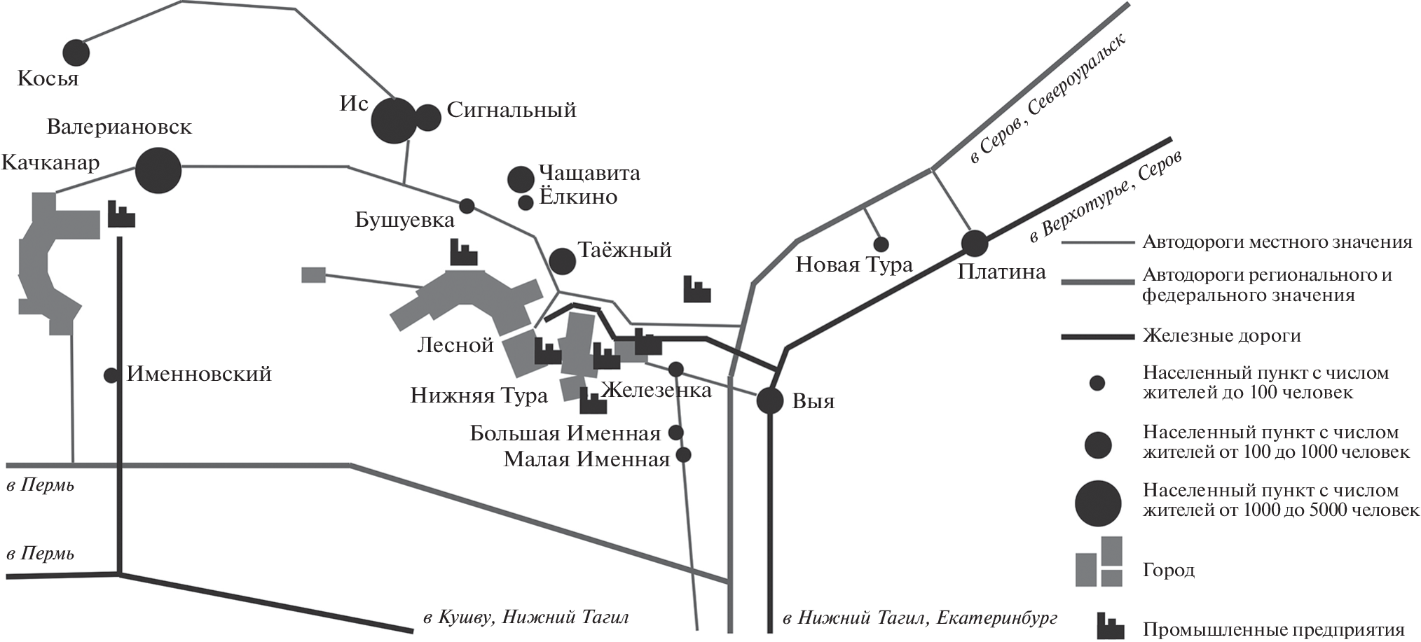 The history of the Urals as part of Russia is closely related to industrial production. It developed during the main waves of modernization in the country and was accompanied by economic development of the territory, the formation of new villages and cities. A significant stage is the post-war period, when large projects for the extraction of minerals, the construction of energy enterprises, and the nuclear industry were implemented in the Ural region. In particular, in Sverdlovsk oblast in the late 1940–1950s, three small cities arose on a compact territory between the cities of Nizhny Tagil and Serov, in the upper reaches of the Tura River. Nizhnyaya Tura, founded in the middle of the 18th century, acted as a springboard for the construction of Kachkanar and Sverdlovsk-45 (modern city of Lesnoy) and thanks to this developed as a diversified center. This territory, at the present stage composed of three urban districts, should be considered as a group of geographically close settlements of the same administrative rank. Its development reflects all-Russian problems: small towns and urban districts; single-industry and multi-industry cities, polarization and compression of the developed space; internal and external challenges. The article examines the formation of a group of geographically close settlements, the dynamics of the population, the trends of socioeconomic development of the territory in the second half of the 2010s–early 2020s. It is shown that the development of a group of settlements was decisively influenced by resource and defense factors, which at the present stage were supplemented by an innovative factor. Kachkanar, a mining center, is a single-industry town; Lesnoy, center of electrochemical engineering, has the status of a closed administrative-territorial entity; in Nizhnyaya Tura there are enterprises of energy, engineering, construction industry. City-forming enterprises were able to adapt to the realities of the modern economy. The number of inhabitants of the territory is decreasing, in the medium term this trend may negatively affect the age composition of the population, the quality of labor resources.