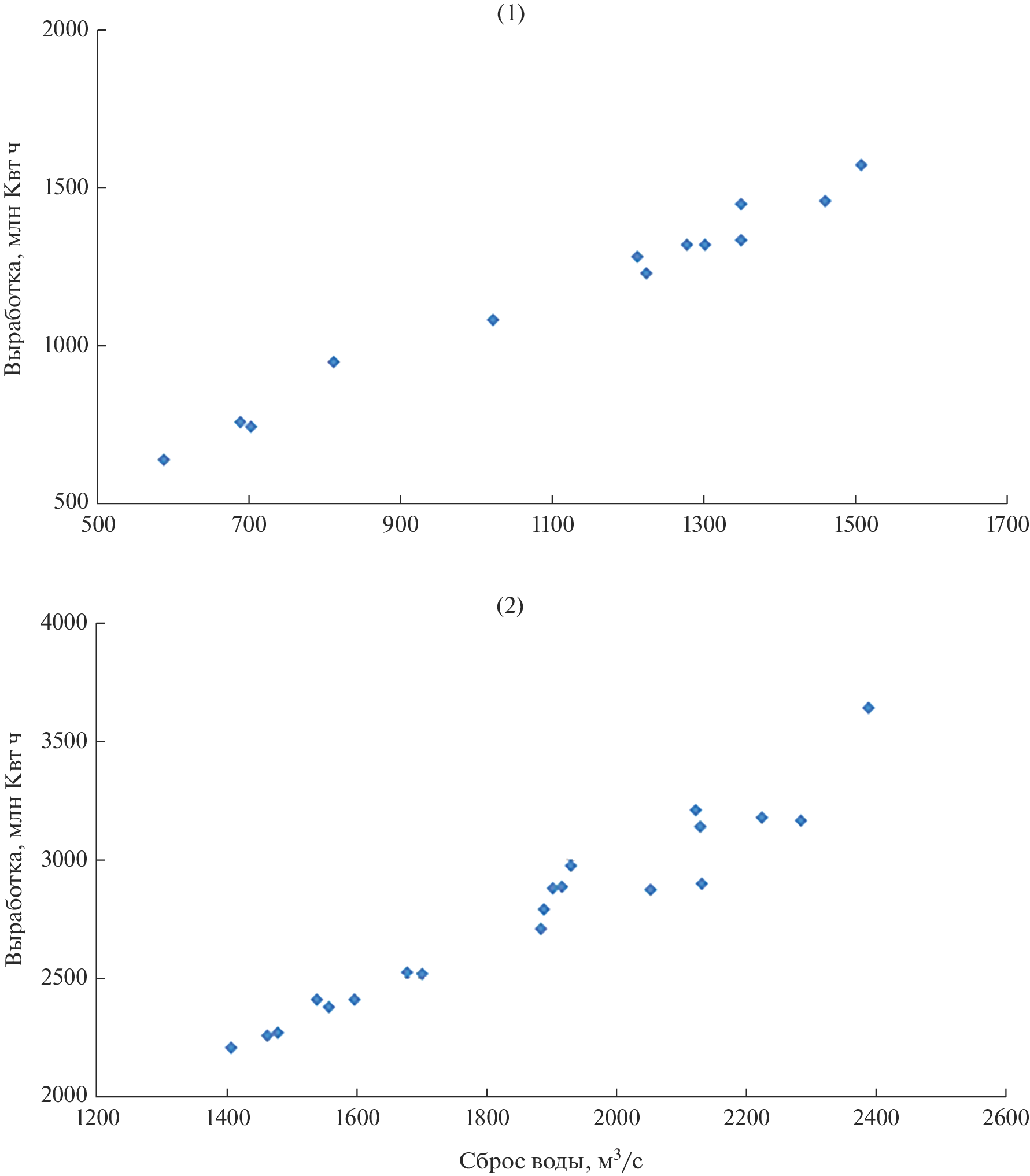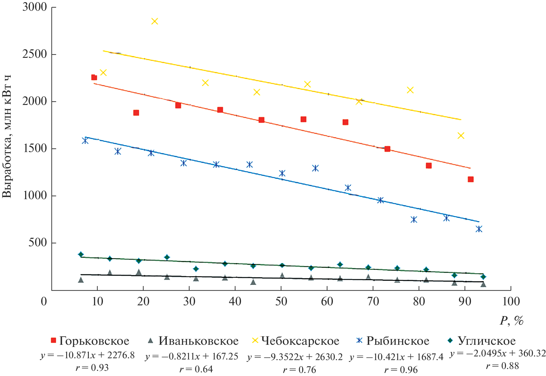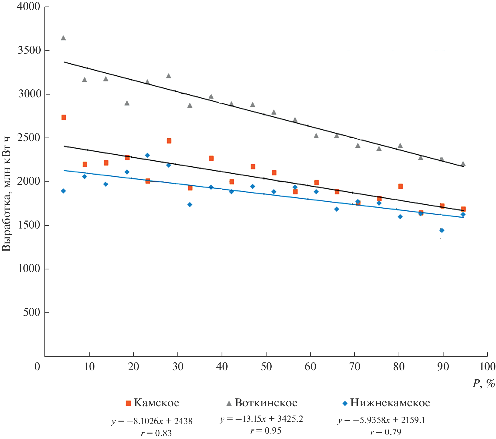 Basic information about the Upper Volga and Kama cascades of reservoirs is presented: water surface area, full and useful volume capacity, and average project power generation. The contribution of the considered cascades to the power generation of the entire Volga−Kama cascade of reservoirs is estimated. Data series have been generated on the annual inflow, discharge of water through hydroelectric facilities, and generation of electricity from 2002 to 2021, for several stations from 2004 to 2022. The relationship between the area of reservoirs and their capacity is shown, as well as the generation of electricity with the water content of individual years and periods. A relationship has been established between the inflow of water into the reservoirs and its discharge through the turbines of the hydroelectric power plants. Particular attention is paid to the Rybinsk reservoir, which performs over-year water storage. The generation of electricity in high-water, medium-water, and low-water years is calculated. The deviation of the actual electricity generation from the average design was estimated, based on which a conclusion was made about the efficiency of the hydroelectric power plants. The probability of electricity generation is determined depending on the predicted values of the river runoff.