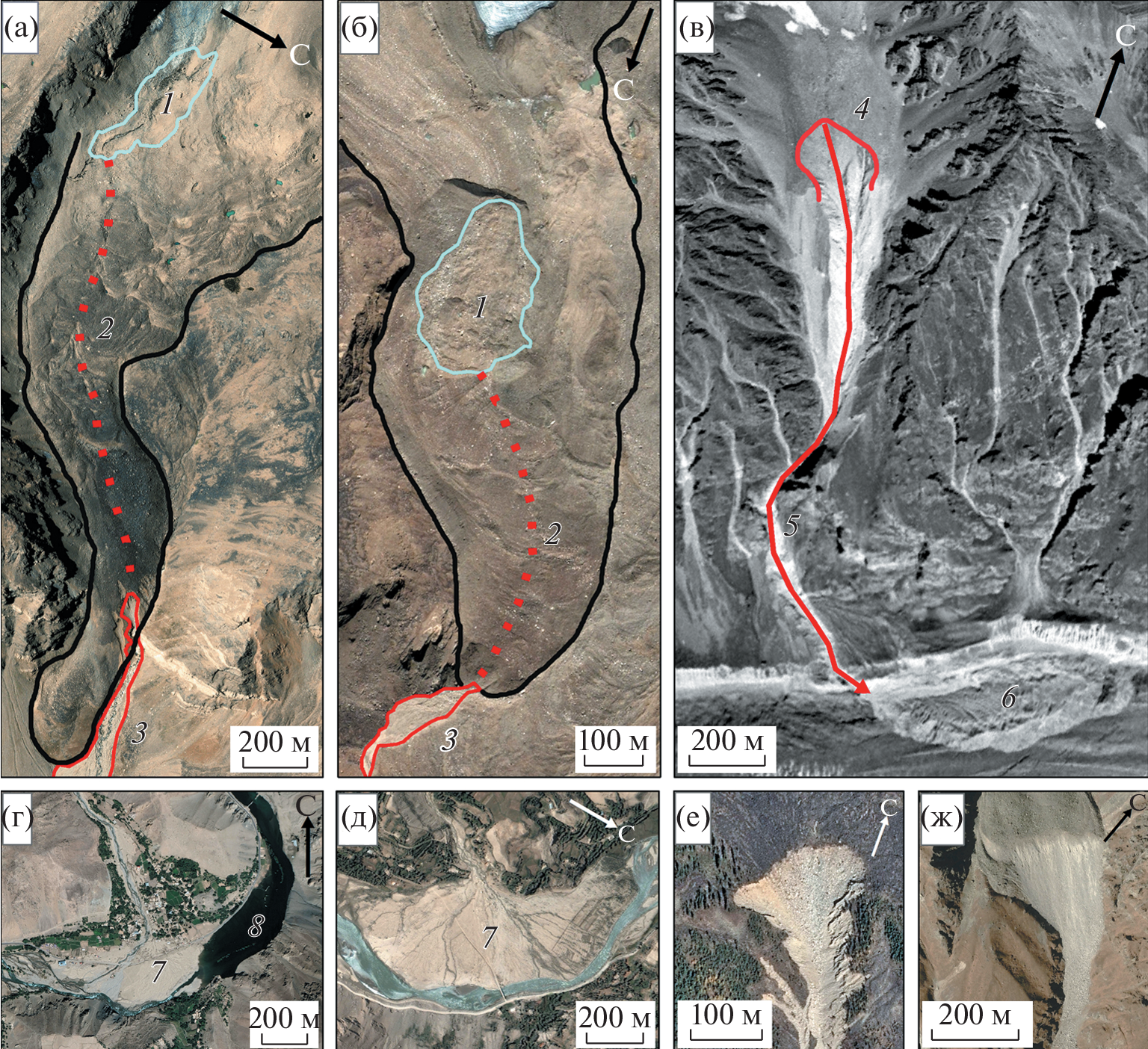 - Leinss S., Bernardini E., Jacquemart M., Dokukin M. Glacier detachments and rock-ice avalanches in the Petra Pervogo range, Tajikistan (1973–2019) // Natural Hazards and Earth System Sciences. 2021. Vol. 21. P. 1409–1429. https://doi.org/10.5194/nhess-21-1409-2021