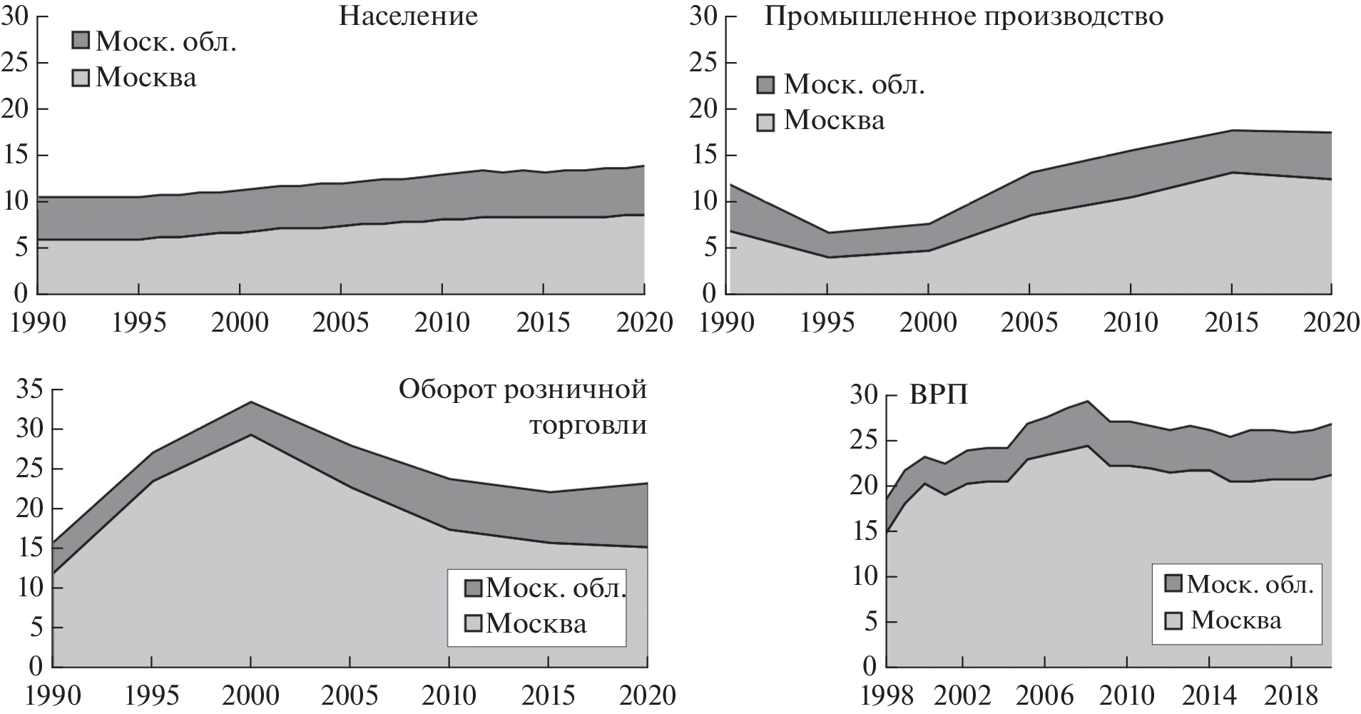 Статья, написанная к юбилею Г.М. Лаппо, посвящена одному из ключевых для него регионов – Московской области. Рассмотрено влияние Москвы на территории области, в том числе по данным сотовых операторов. Упор сделан на изменение территориальных структур Подмосковья на базе полимасштабного подхода и дробных статистических данных. Показано, что в постсоветский период с развитием скоростного транспорта продолжала расширяться территория Московской агломерации. Определены масштабы сезонных пульсаций границ и населения Московской агломерации при росте объемов трудовой маятниковой миграции. Показано, что агломерации второго порядка сохраняют свою роль локальных центров притяжения. Выявлены разнонаправленные территориальные сдвиги населения, промышленности, сельского хозяйства, торговли и услуг за последние 30 лет. В 1990-х годах наибольшая концентрация была типична для промышленности, к 2020 г. она стала наименьшей. Вперед вышли розничная торговля и услуги, особенно у МКАД, где спрос растущего населения столицы смыкается с областным. Концентрируется и рассредоточенное прежде сельское хозяйство, что связано с его переходом на индустриальный путь развития в рамках крупных предприятий, что не отменяет развития и малых форм хозяйствования, и расширения дачного землепользования. Комплексные полимасштабные территориально-отраслевые сдвиги выявляются как при сравнении Московской области с Москвой, так и при анализе распределения типов структур (аграрных, индустриальных, сервисных). Направления этих сдвигов показаны в разные периоды между 1990 и 2020 гг. Потенциал Подмосковья, сопоставимый с Санкт-Петербургом, – результат не только и не столько его выноса из Москвы, сколько притяжения к ней населения и деятельности. Но в строительном, торговом, логистическом и, особенно, дачном бумах видны и признаки выплеска столичной активности, подтверждая тезис Г.М. Лаппо, согласно которому рост Московского региона “от города” чередуется и сочетается с ростом “от района”.