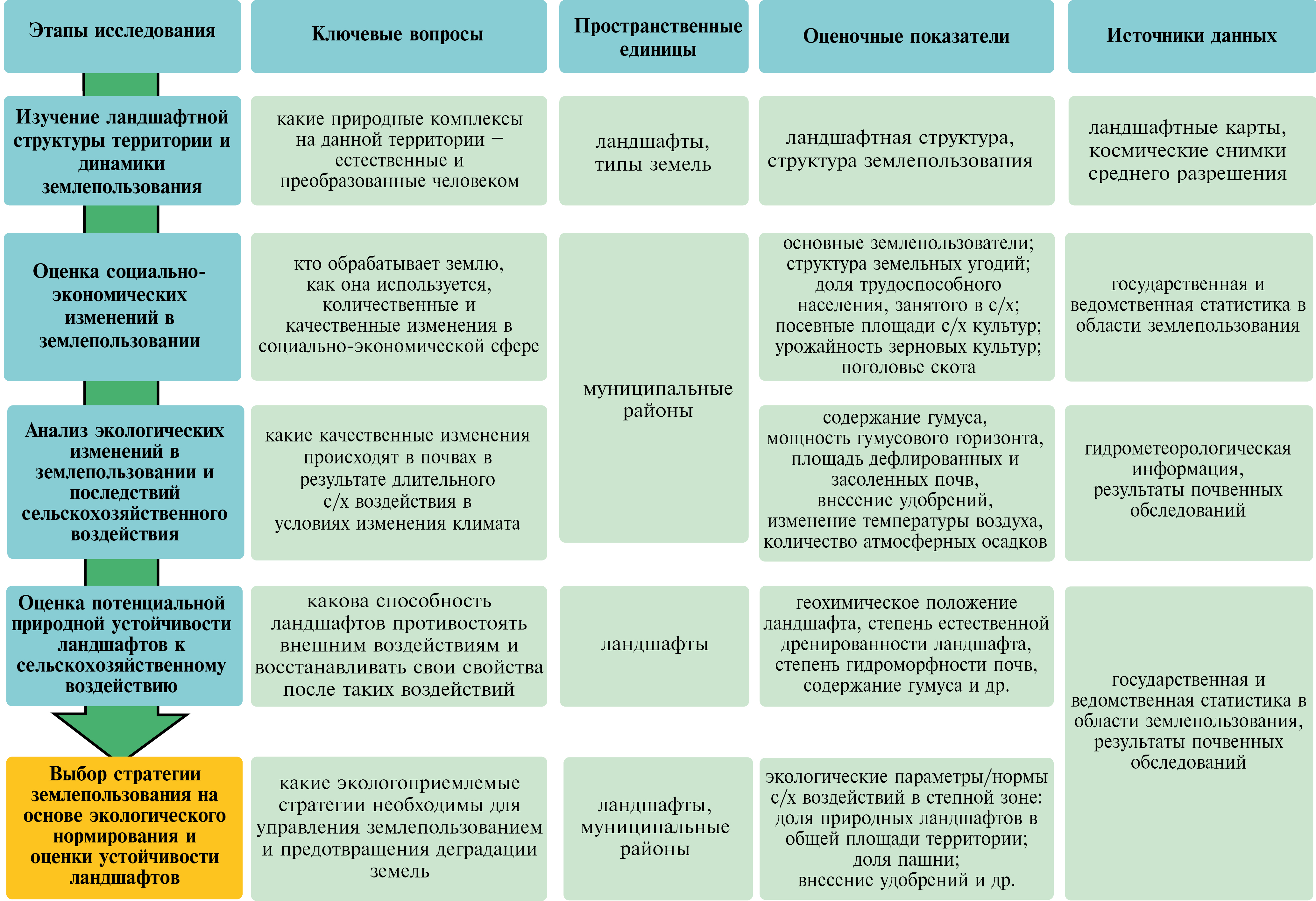 Алгоритм исследования предусматривает пять основных этапов стратегического пространственного планирования (рис. 2). Их реализация способствует не только сохранению ландшафтов, но и достижению единства политических экологических инструментов управления, направленных на предотвращение деградации засушливых земель в трансграничных условиях. Реализуя этот алгоритм, можно проследить взаимосвязи между природной основой сельскохозяйственного землепользования (этап 1), социально-экономической и институциональной структурой, формирующей систему землепользования (этап 2) и результатом их взаимодействия в виде экологических изменений (этап 3), перейти к проектированию экологоприемлемой структуры землепользования на основе оценки устойчивости засушливых ландшафтов (этап 4) и разработке стратегий сельскохозяйственного землепользования с учетом целей аграрного развития и сохранения экологического баланса по обе стороны границы (этап 5). Данный подход реализован для трансграничной территории Кулунды.
