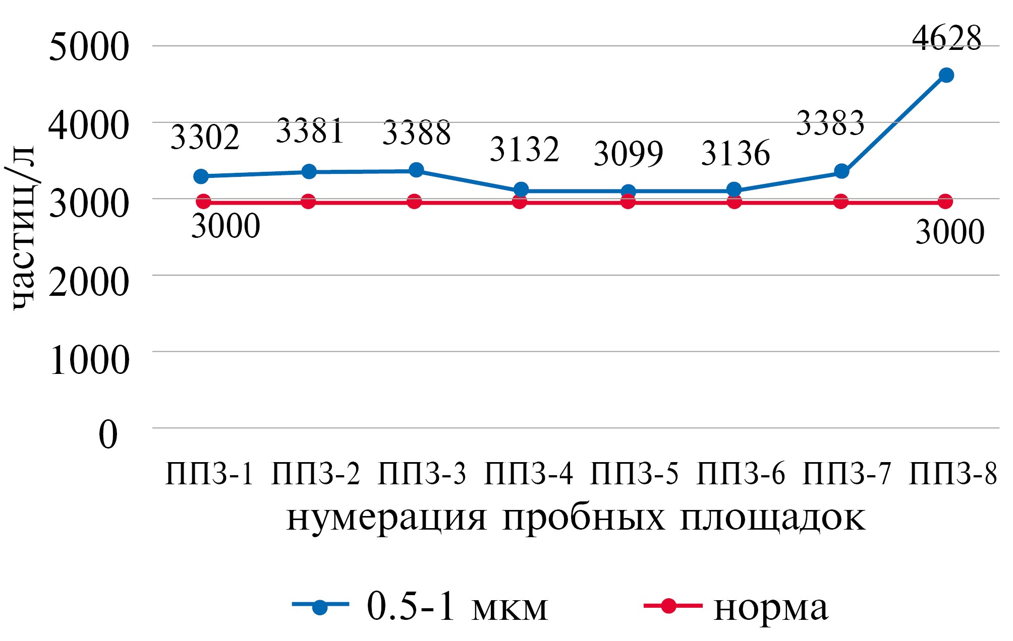 Были рассмотрены значения мелкодисперсного аэрозоля с размером частиц 500–1000 нм (беспрепятственно проникающих в дыхательные пути до поверхности альвеол), для которых по данным (Поволоцкая и др., 2021) определены допустимые уровни аэрозольной нагрузки (рис. 3). Данные мониторинга аэрозольных частиц размером 500–1000 нм фактически соответствовали чистому природному фону. Аэрозольных частиц размерного ряда 5–10 мкм было незначительное количество, на уровне исключительно чистого природного фона.