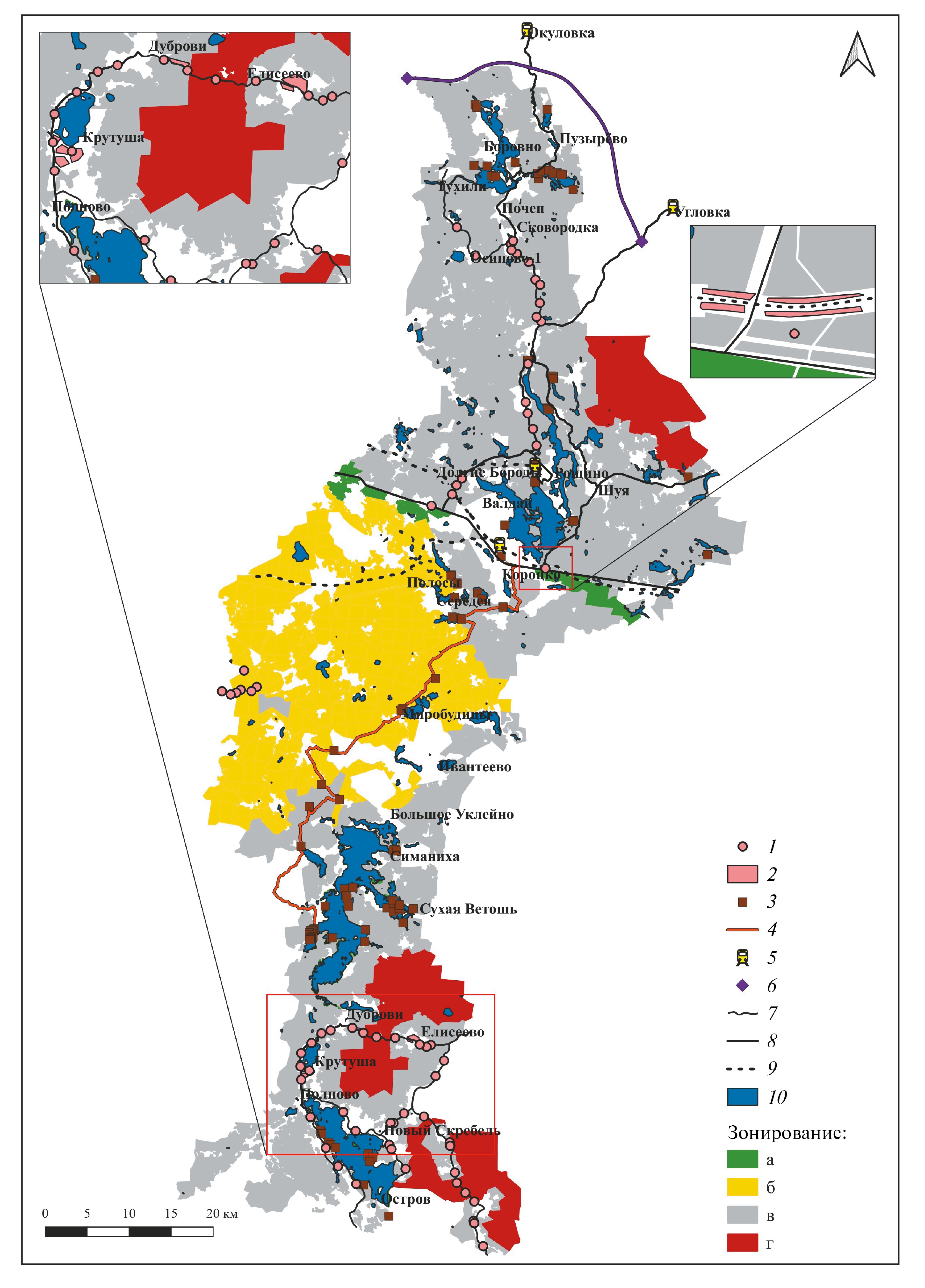 Рис. 1. Распространение борщевика Сосновского на территории Национального парка “Валдайский”: 1 – места встречи небольших популяций Heracleum sosnowskyi; 2 – места массового произрастания Heracleum sosnowskyi; 3 – туристические стоянки; 4 – Большая Валдайская тропа; 5 – железнодорожные станции; 6 – 408-й и 434-й км трассы федерального значения М-11; 7 – грунтовые/гравийные дороги районного значения; 8 – асфальтированные дороги областного значения; 9 – железные дороги; 10 – озера. Зонирование парка: а – хозяйственная зона; б – особо охраняемая зона; в – рекреационная зона; г – заповедная зона.
